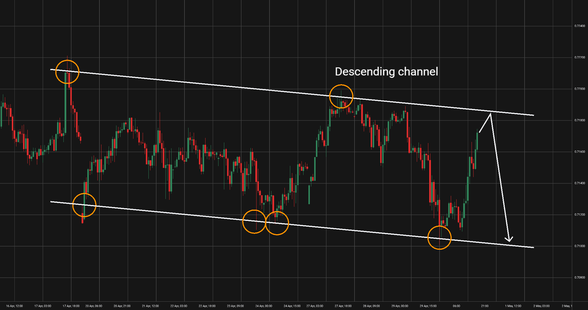 AUD/USD: Tento měnový pár je na 1hodinovém grafu v klesajícím trendovém kanálu, který platí po šesti odrazech již od 17. dubna.