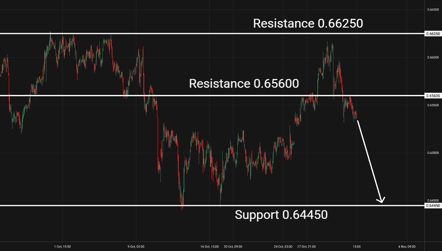 AUD/USD: Tento měnový pár je na 1hodinovém grafu v klesajícím trendu a došlo k otestování supportu 0,6540.