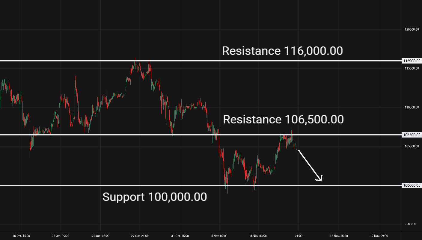 Bitcoin (BTC/USD): Tato kryptoměna je na 1hodinovém grafu v klesajícím trendu. Support je na hladině 100000. Rezistence je na hladině 106500 a 116000. Nyní bychom mohli uvažovat o short pozici se Stop-Lossem nad předchozím maximem. Blížící se fundamentální zprávy by neměly ovlivnit vývoj tohoto trhu.