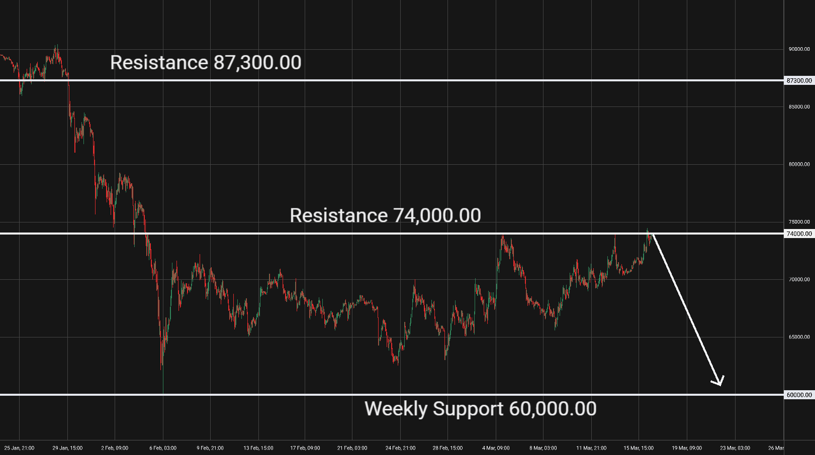 Bitcoin (BTC/USD): Tato kryptoměna je na 1hodinovém grafu v rostoucím trendu. Support je na hladině 60000. Rezistence je na hladině 74000 a 87300. V případě odrazu od rezistence bychom mohli uvažovat o short pozici s cílem u nejbližšího supportu. V případě jasného prolomení rezistence bychom mohli uvažovat o long pozici. Blížící se fundamentální zprávy by neměly ovlivnit vývoj tohoto trhu.