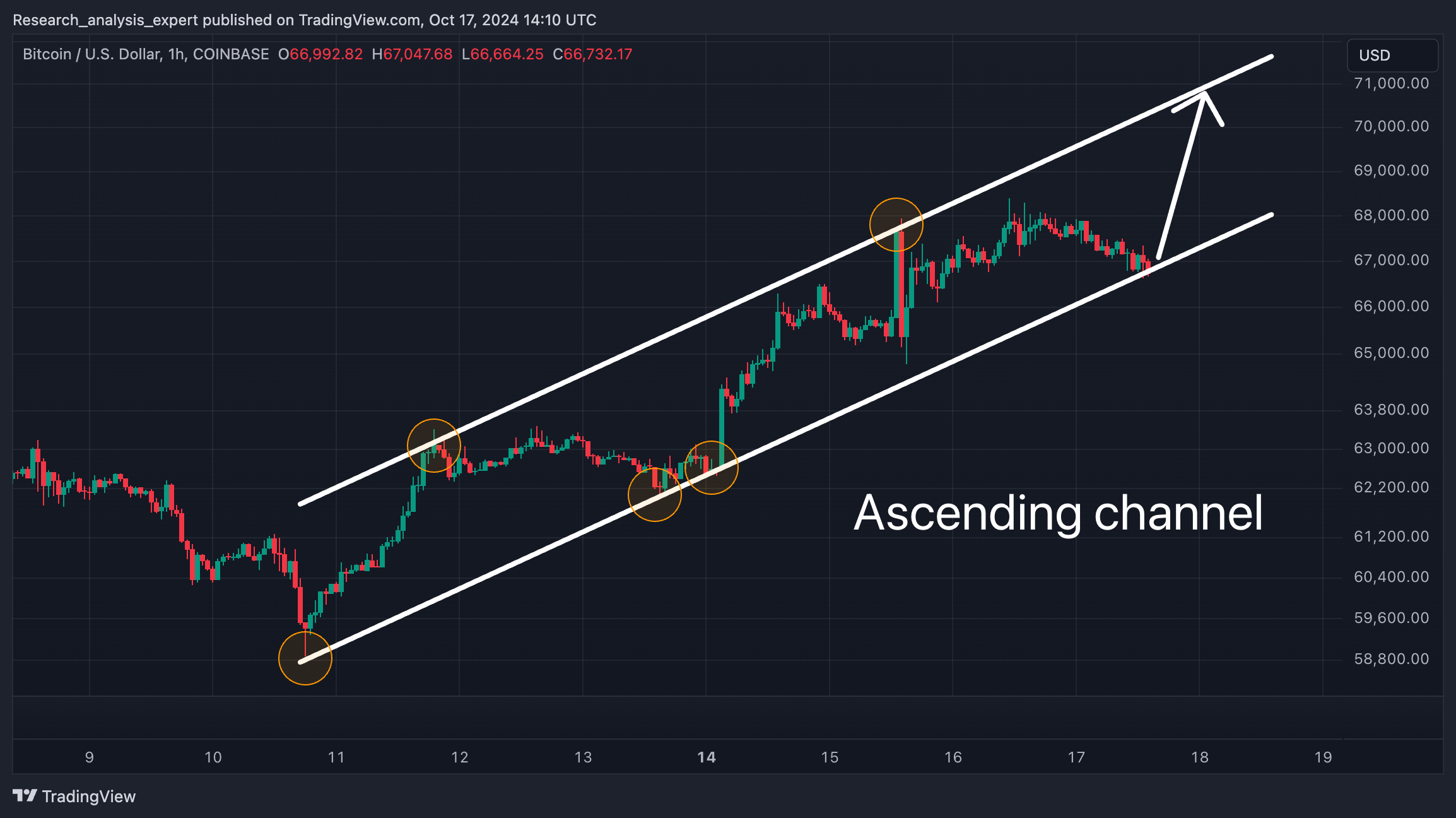 Bitcoin (BTC/USD): Tato kryptoměna je na 1hodinovém grafu v rostoucím trendovém kanálu, který platí po pěti odrazech již od 10. října.