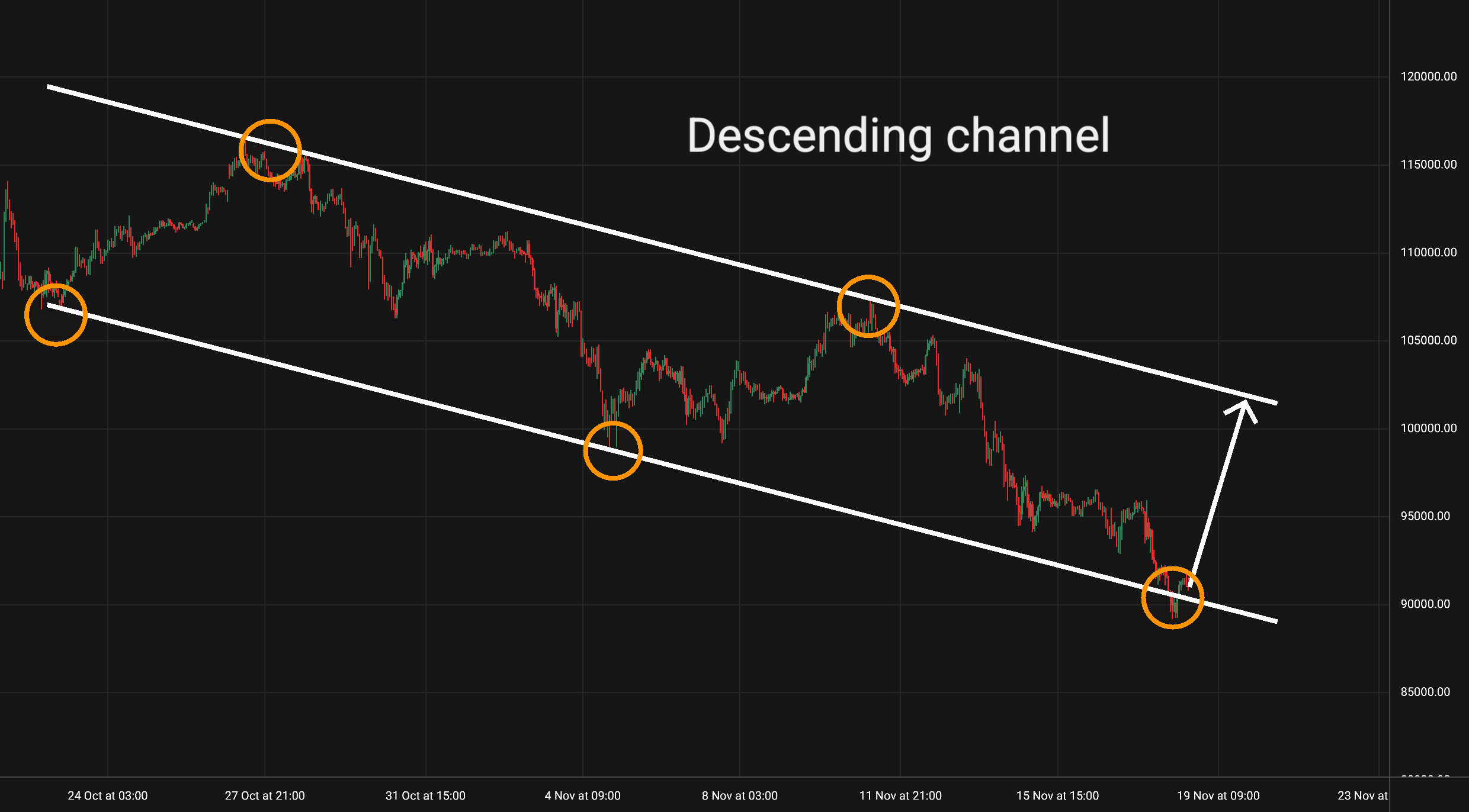 Bitcoin (BTC/USD): Tato kryptoměna je na 1hodinovém grafu v klesajícím trendovém kanálu, který platí po čtyřech odrazech již od 23. října. -