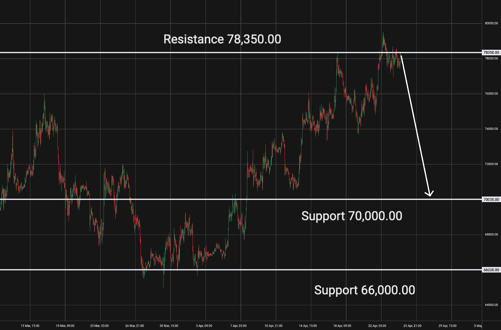 Bitcoin (BTC/USD): Tato kryptoměna je na 1hodinovém grafu v klesajícím trendu. Support je na hladině 70000 a 66000. Rezistence je na hladině 78350. Nyní bychom mohli uvažovat o short pozici se Stop-Lossem nad předchozím maximem. Blížící se fundamentální zprávy by neměly ovlivnit vývoj tohoto trhu. -