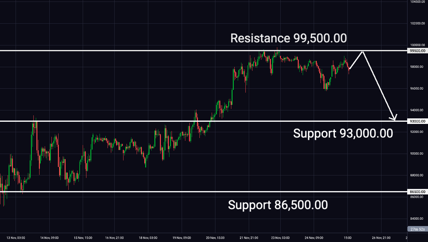Bitcoin (BTC/USD): Tato kryptoměna je na 1hodinovém grafu v rostoucím trendu. Support je na hladině 93000 a 86500. Rezistence je na hladině 99500. V případě odrazu od rezistence bychom mohli uvažovat o short pozici s cílem u nejbližšího supportu. V případě jasného prolomení rezistence bychom mohli uvažovat o long pozici. Blížící se fundamentální zprávy by neměly ovlivnit vývoj tohoto trhu.