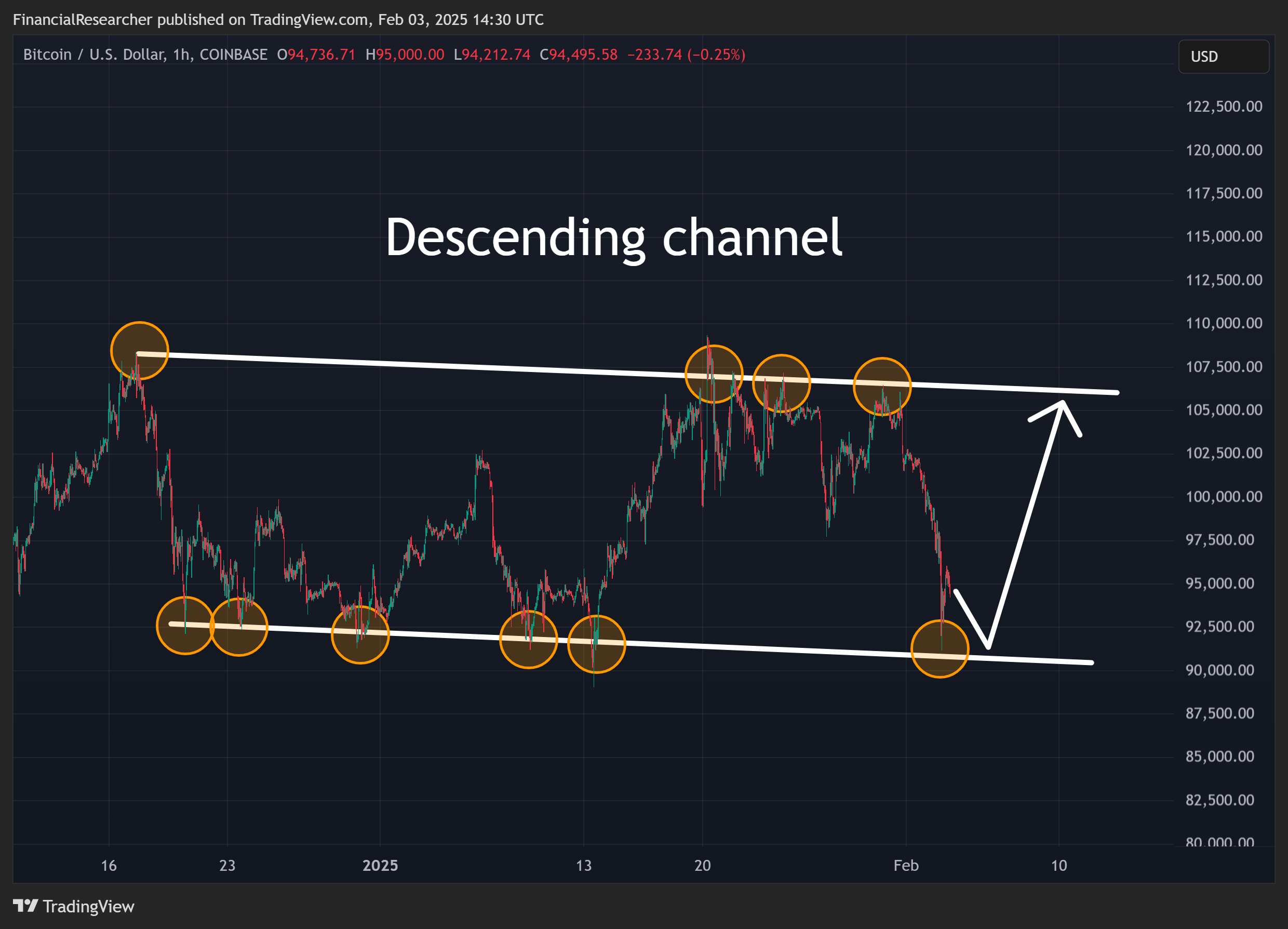 Bitcoin (BTC/USD): Tato kryptoměna je na 1hodinovém grafu v klesajícím trendovém kanálu, který platí po šesti odrazech již od 30. ledna. -