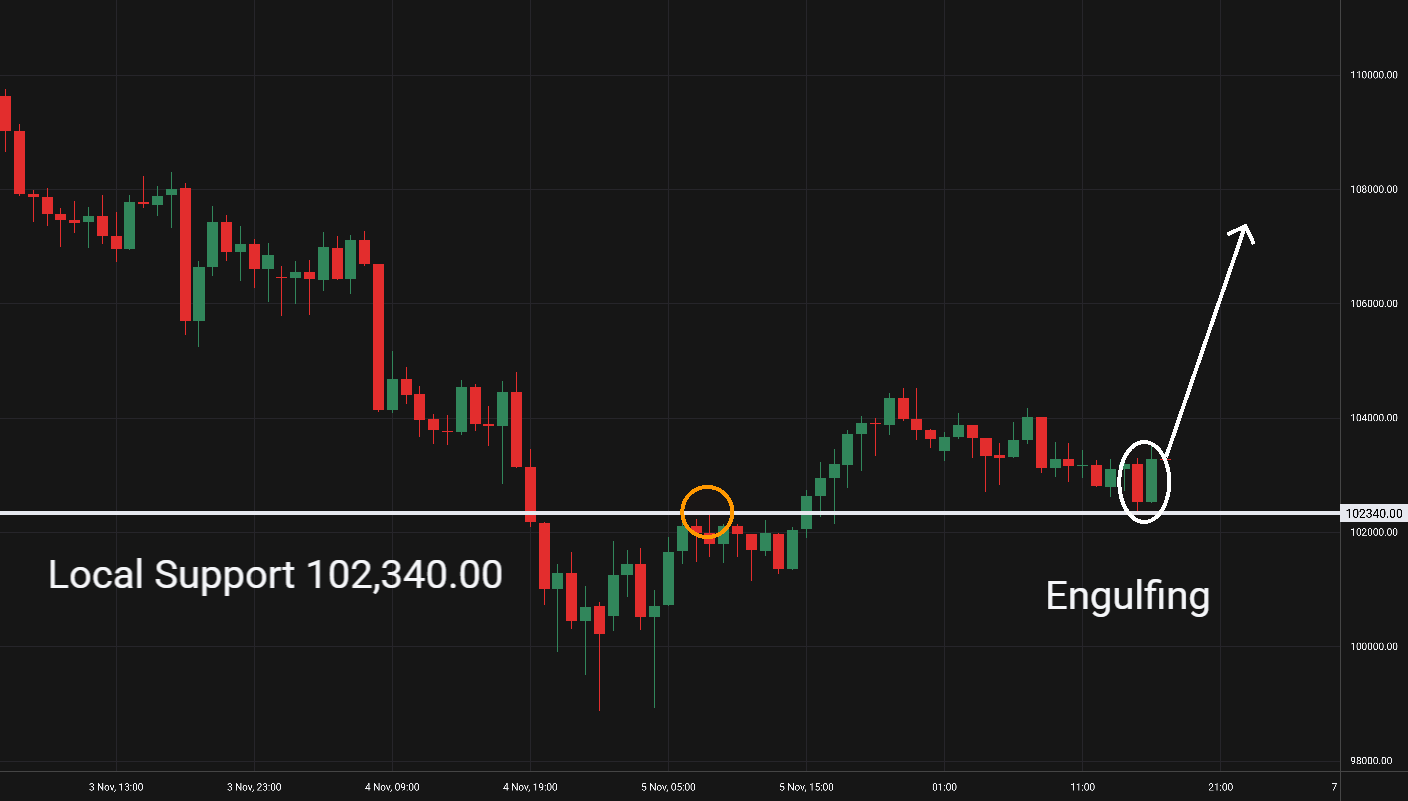 Bitcoin (BTC/USD): Tato kryptoměna je na 1hodinovém grafu v klesajícím trendu několik hodin. Vytvořila se formace býčí pohlcení (Engulfing) na lokálním supportu. Cena je tak připravena na růst a mohli bychom uvažovat o long pozici. Blížící se fundamentální zprávy by neměly ovlivnit vývoj tohoto trhu.