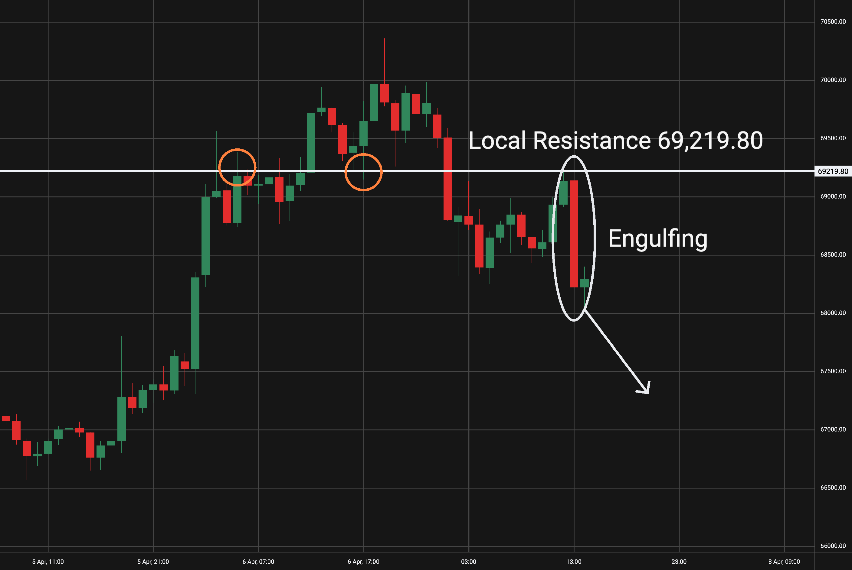 Bitcoin (BTC/USD): Tato kryptoměna je na 1hodinovém grafu v rostoucím trendu několik hodin. Vytvořila se formace medvědí pohlcení (Engulfing) na lokální rezistenci. Cena je tak připravena na pokles a mohli bychom uvažovat o short pozici. Blížící se fundamentální zprávy (zboží dlouhodobé spotřeby) by mohly ovlivnit vývoj tohoto trhu.