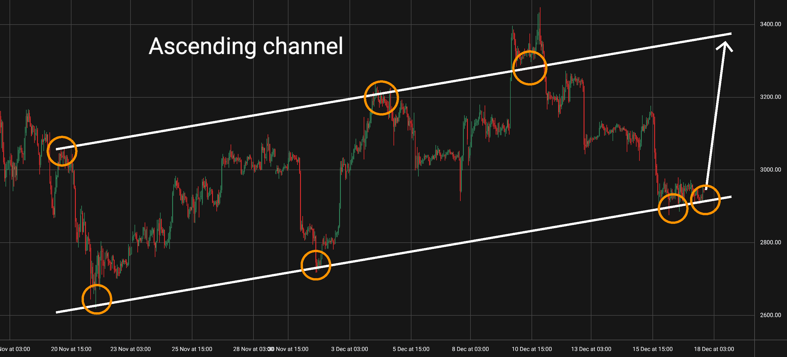 Ethereum (ETH/USD): Tato kryptoměna je na 1hodinovém grafu v rostoucím trendovém kanálu, který platí po sedmi odrazech již od 20. listopadu.