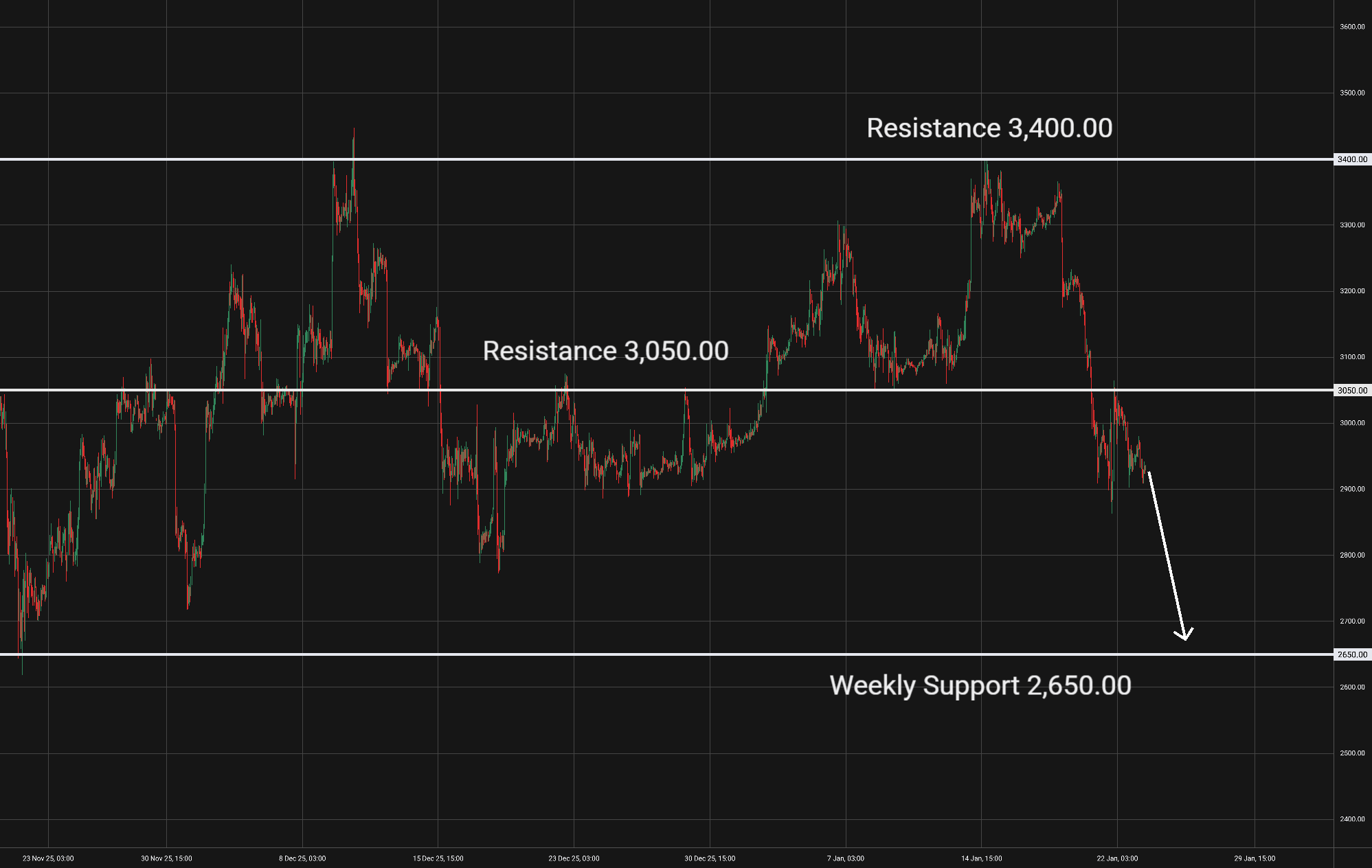 Ethereum (ETH/USD): Tato kryptoměna je na 1hodinovém grafu v klesajícím trendu. Support je na hladině 2650. Rezistence je na hladině 3050 a 3400. Nyní bychom mohli uvažovat o short pozici se Stop-Lossem nad předchozím maximem. Blížící se fundamentální zprávy (PMI v USA) by mohly ovlivnit vývoj tohoto trhu. Někteří obchodníci mohou v pátek uzavírat své pozice, což by mohlo dostat tento trh pod tlak.