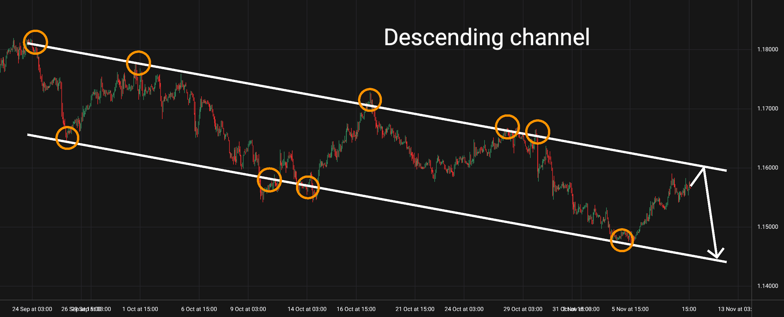 Možný scénář: Nyní bychom mohli počkat na odraz od horní linie kanálu a pak uvažovat o short pozici s cílem u spodní linie trendového kanálu.