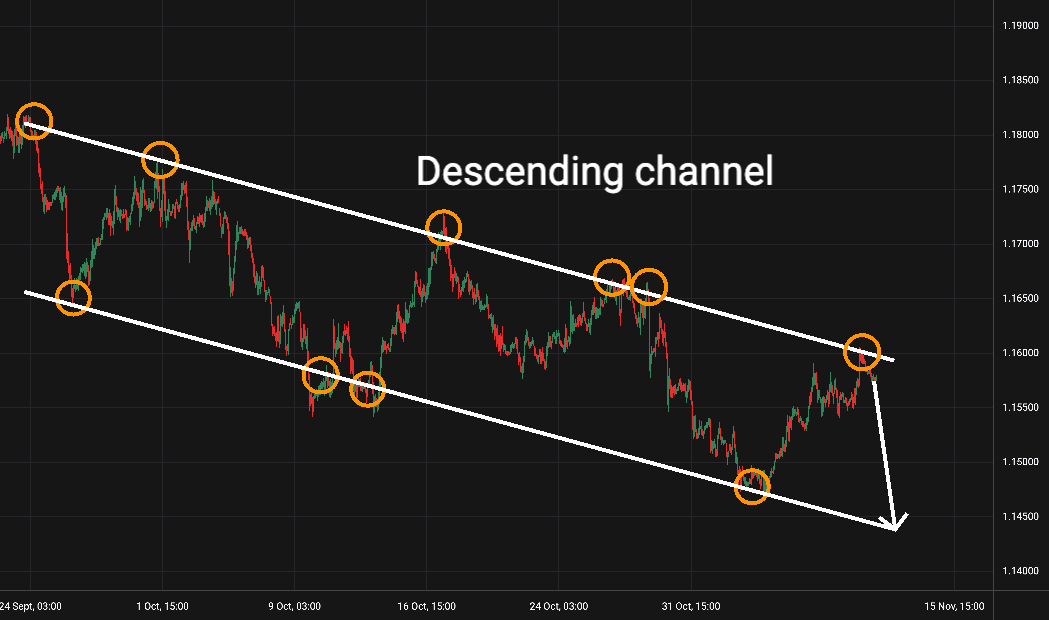 EUR/USD: Tento měnový pár je na 1hodinovém grafu v klesajícím trendovém kanálu, který platí po pěti odrazech již od 17. října. -