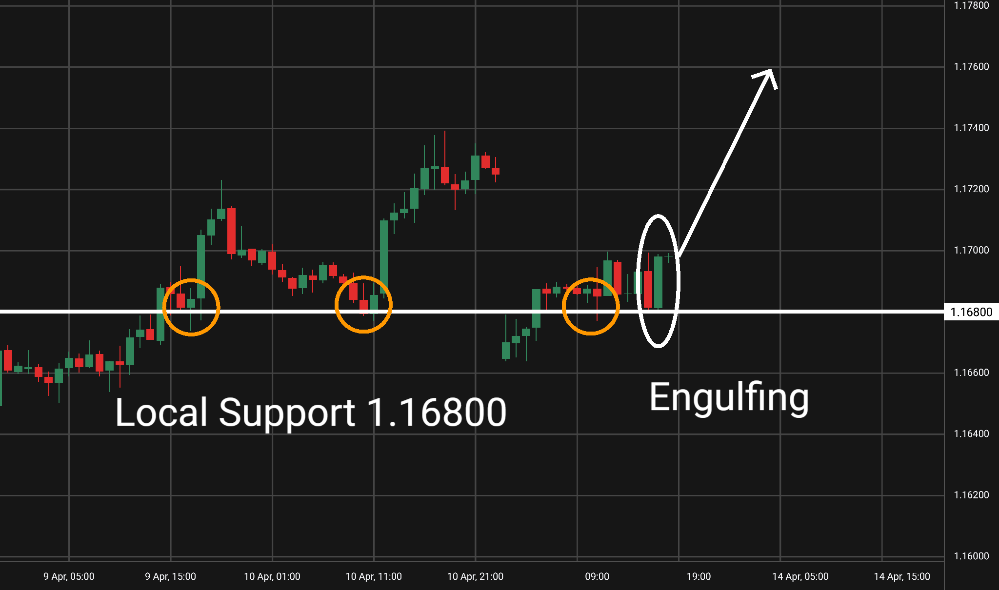EUR/USD: Tento měnový pár je na 1hodinovém grafu v pohybu do strany několik hodin. Vytvořila se formace býčí pohlcení (Engulfing) na lokálním supportu. Cena je tak připravena na růst a mohli bychom uvažovat o long pozici. Blížící se fundamentální zprávy by neměly ovlivnit vývoj tohoto měnového páru.