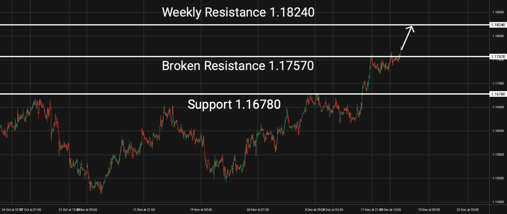Dokud se měnový pár EUR/USD bude obchodovat nad supportem 1,1670, tak můžeme očekávat pokračování rostoucího trendu směrem k hladině rezistence 1,1910 a dále pak směrem k 1,2037. -