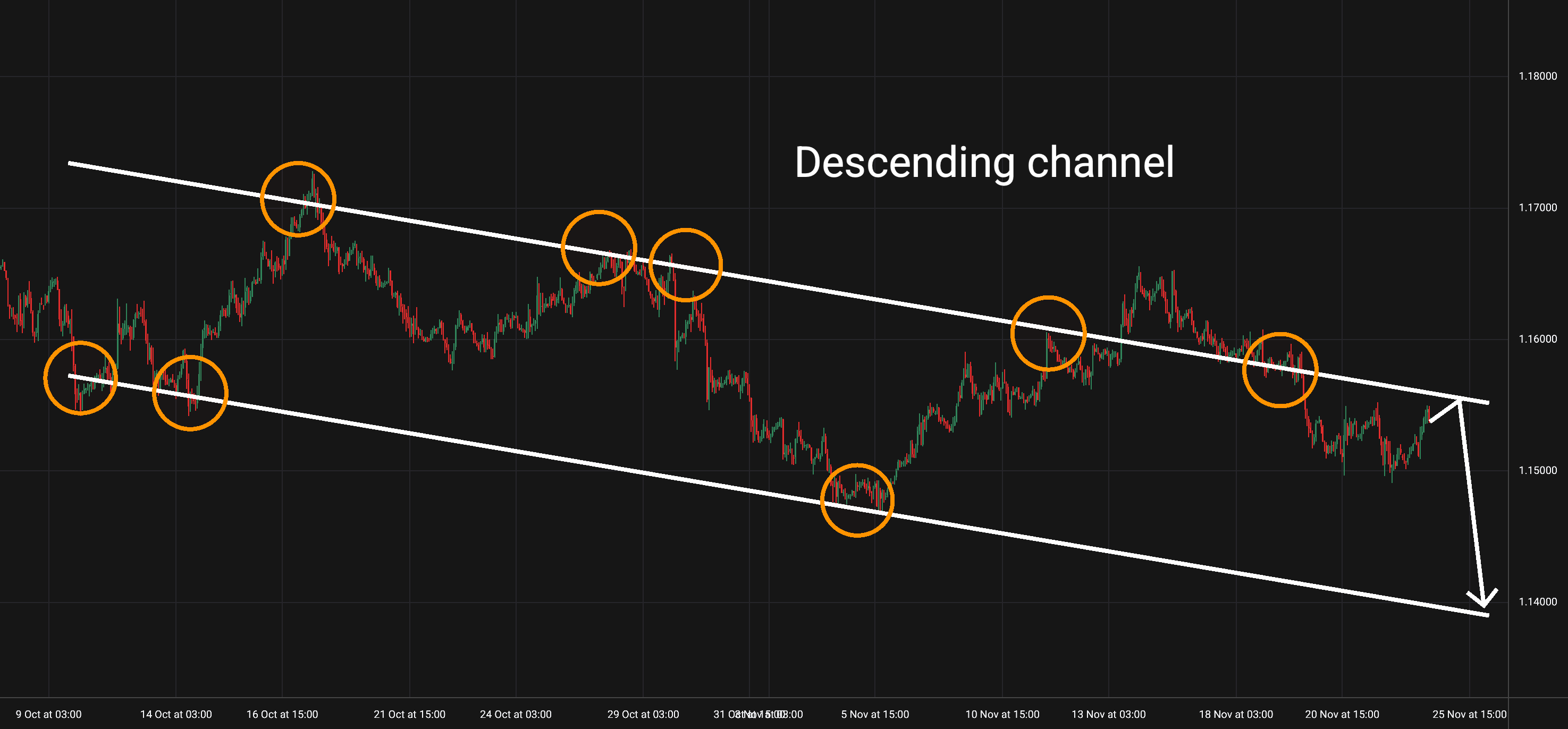 EUR/USD: Tento měnový pár je na 1hodinovém grafu v klesajícím trendovém kanálu, který platí po osmi odrazech již od 9. října.