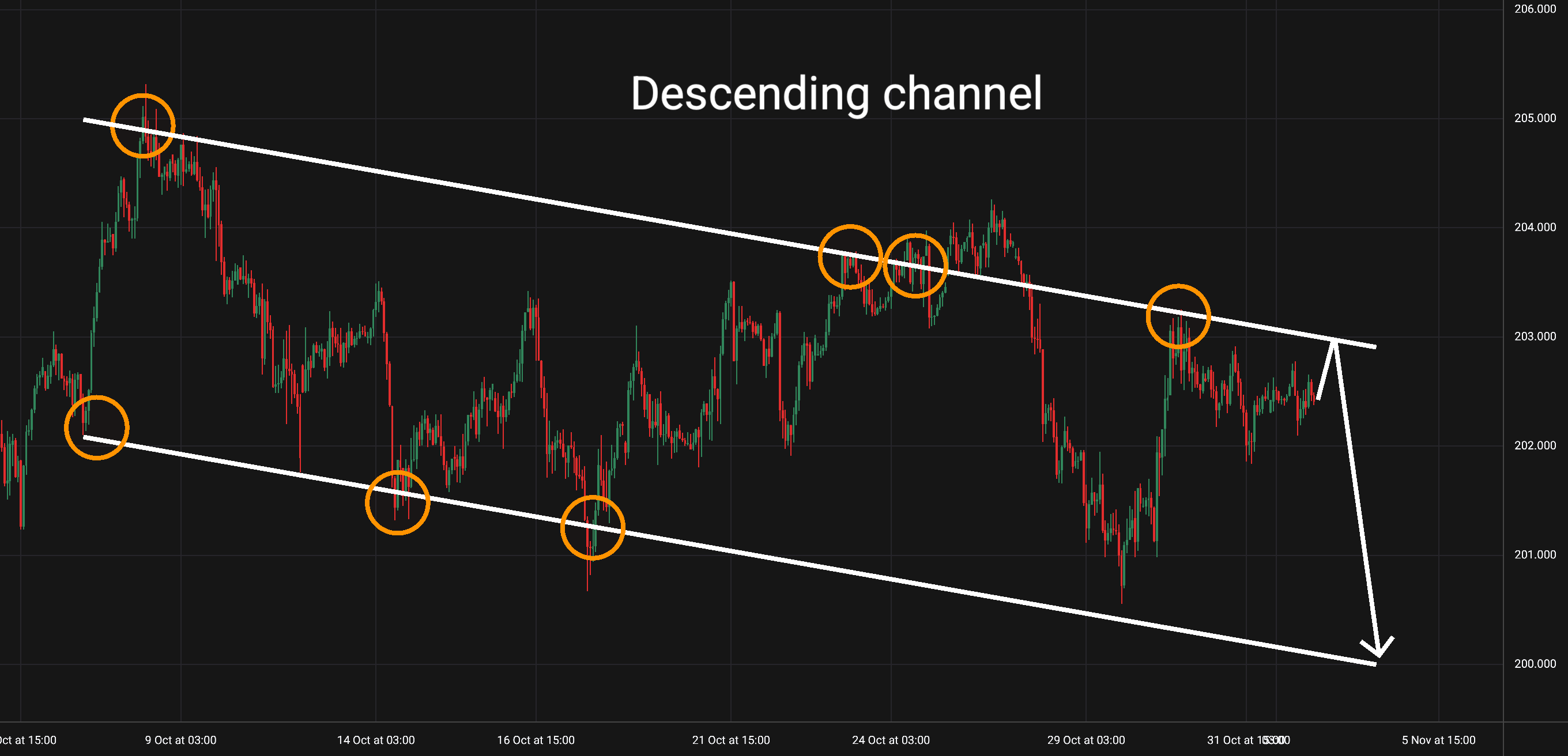 Možný scénář: Nyní bychom mohli počkat na odraz od horní linie kanálu a pak uvažovat o short pozici s cílem u spodní linie tohoto kanálu.