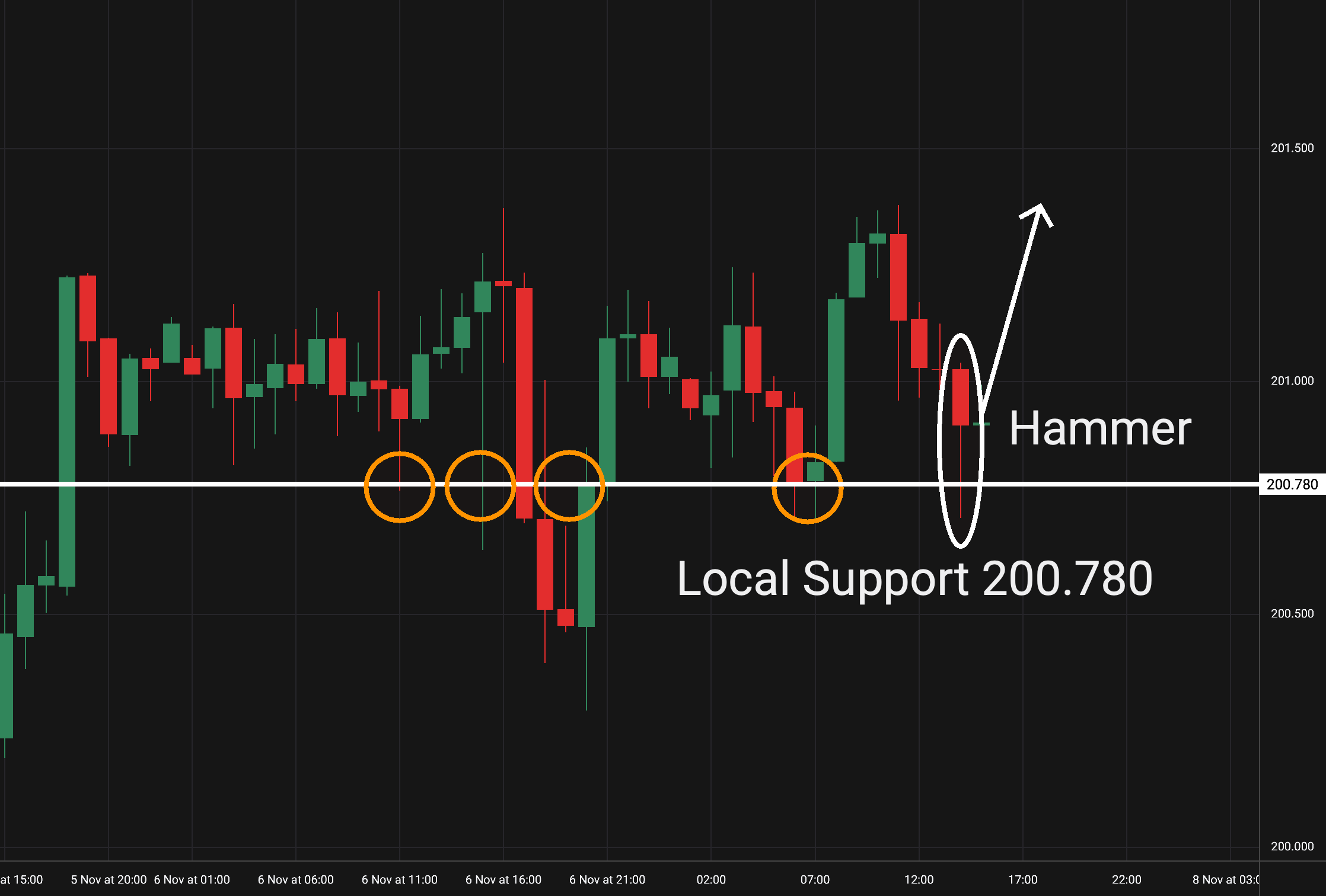 GBP/JPY: Tento měnový pár je na 1hodinovém grafu v rostoucím trendu několik hodin. Vytvořila se formace ranní hvězda (Morning Star) na lokálním supportu. Cena je tak připravena na růst a mohli bychom uvažovat o long pozici. Blížící se fundamentální zprávy by neměly ovlivnit vývoj tohoto měnového páru. -