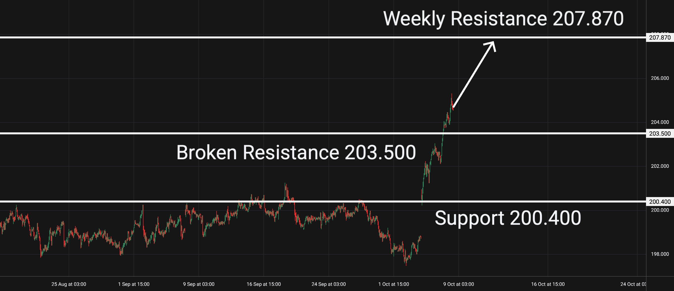 GBP/JPY: Tento měnový pár je na 1hodinovém grafu v rostoucím trendu několik hodin. Support je na hladině 203,50 a 200,40. Rezistence je na hladině 207,80. Nyní bychom mohli uvažovat o long pozici se Stop-Lossem pod předchozím minimem. Blížící se fundamentální zprávy by neměly ovlivnit vývoj tohoto měnového páru.