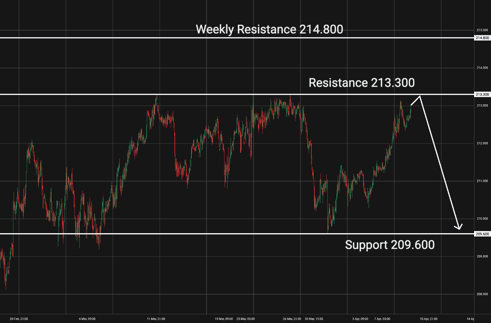GBP/JPY: Tento měnový pár je na 1hodinovém grafu v rostoucím trendu několik hodin. Support je na hladině 209,60. Rezistence je na hladině 213,30 a 214,80. V případě odrazu od rezistence bychom mohli uvažovat o short pozici s cílem u nejbližšího supportu. V případě jasného proražení rezistence bychom mohli uvažovat o long pozici. Blížící se fundamentální zprávy by neměly ovlivnit vývoj tohoto měnového páru.