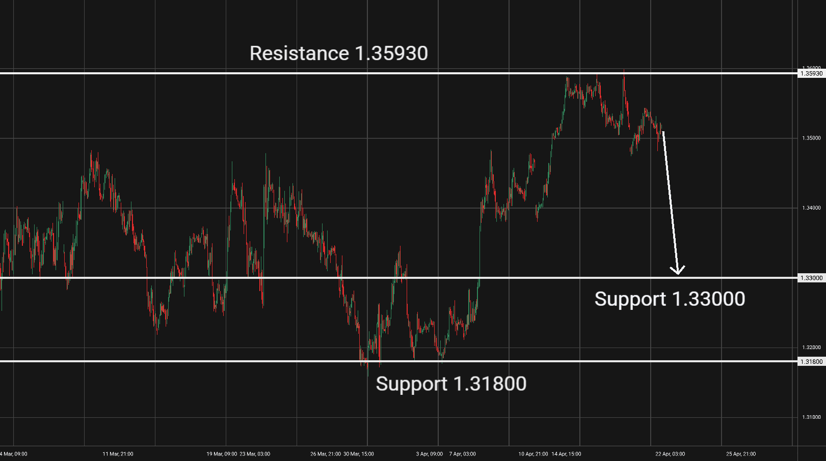 Dokud se měnový pár GBP/USD bude obchodovat pod rezistencí 1,3587, tak můžeme očekávat pokles směrem k hladině supportu 1,3135. -
