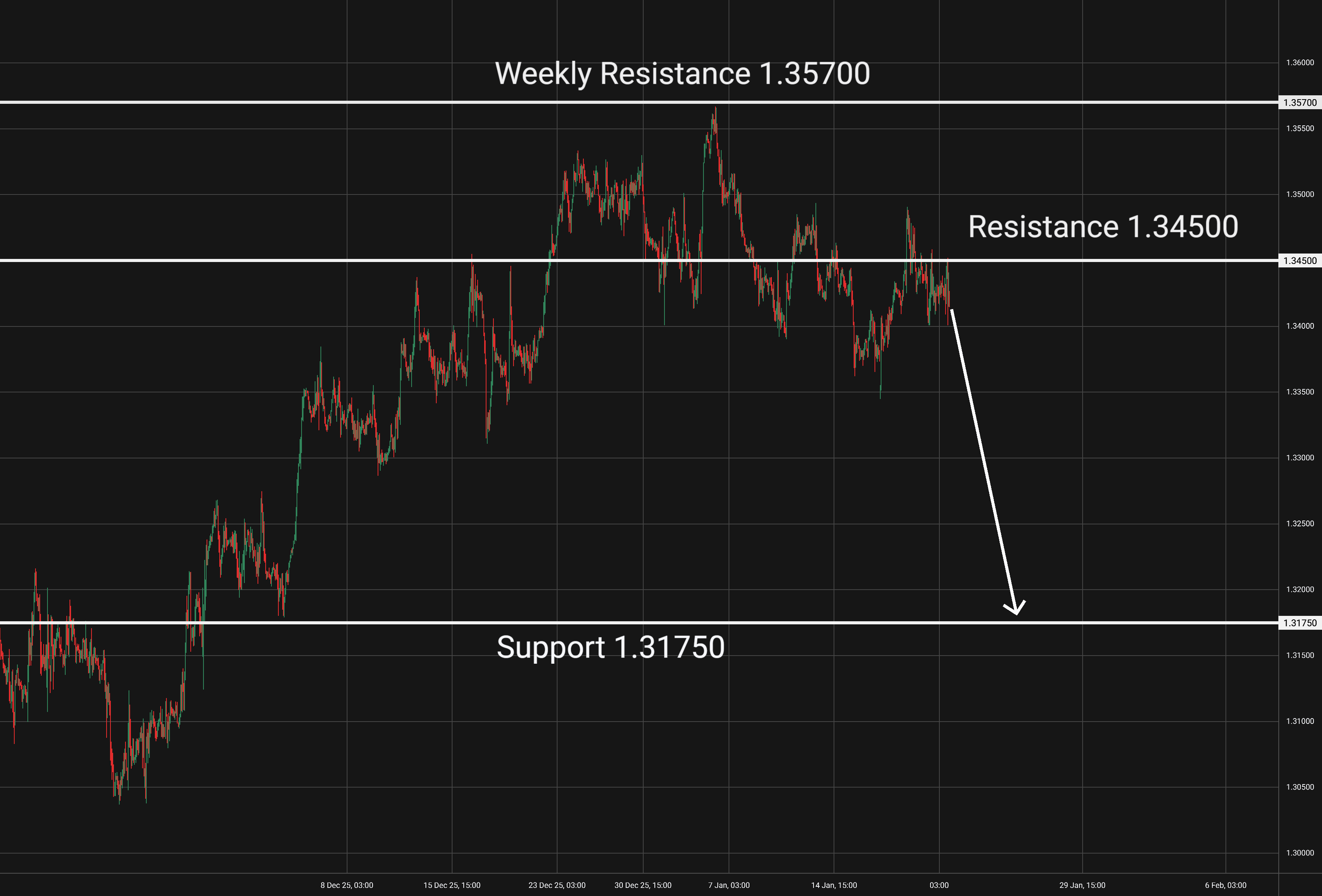 Dokud se měnový pár GBP/USD bude obchodovat pod rezistencí 1,3587, tak můžeme očekávat pokles směrem k hladině supportu 1,3135. -
