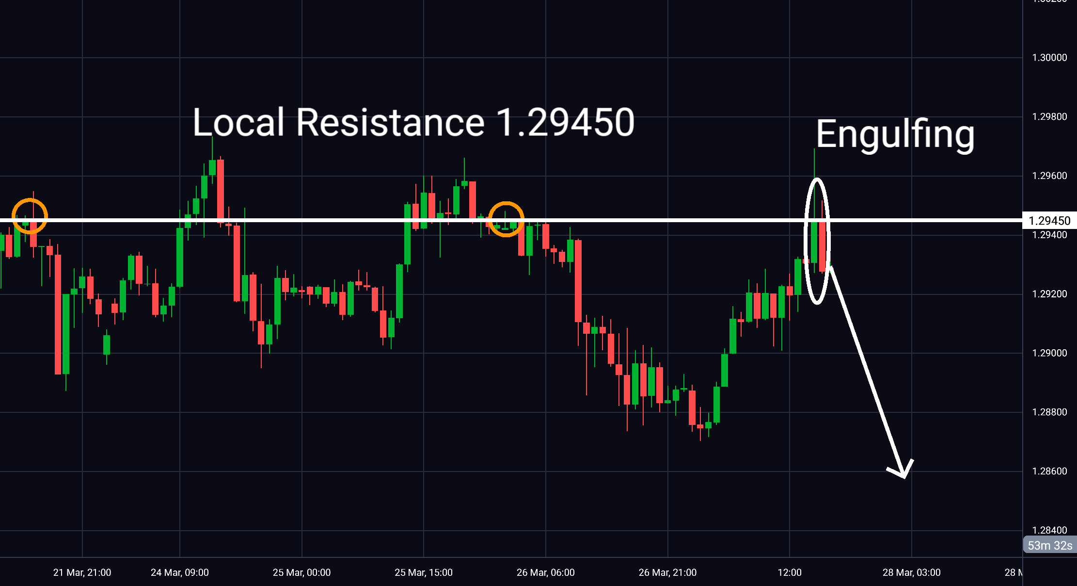 GBP/USD: Tento měnový pár je na 1hodinovém grafu v rostoucím trendu několik hodin. Vytvořila se formace medvědí pohlcení (Engulfing) na lokální rezistenci. Cena je připravena na pokles a mohli bychom uvažovat o short pozici. Blížící se fundamentální zprávy (spotřebitelská důvěra v USA) by mohly ovlivnit vývoj tohoto měnového páru. -