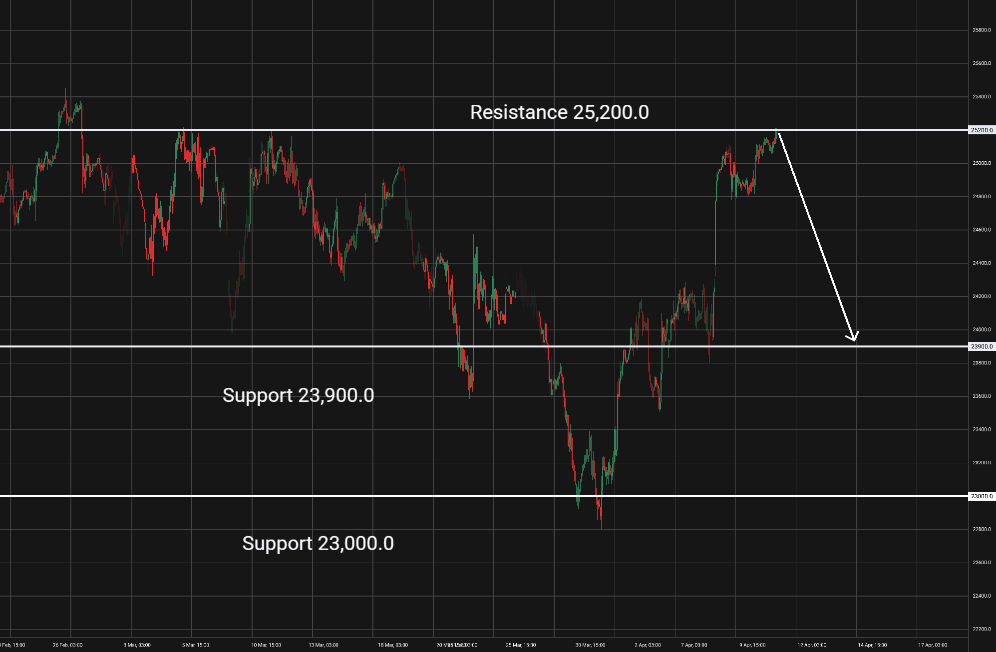 Nasdaq: Tento akciový index je na 1hodinovém grafu v klesajícím trendu několik hodin. Support je na hladině 24500 a 24000. V případě odrazu od supportu bychom mohli uvažovat o long pozici s cílem u nejbližší rezistence. V případě jasného prolomení supportu bychom mohli uvažovat o short pozici. Rezistence je na hladině 25870. Blížící se fundamentální zprávy by neměly ovlivnit vývoj tohoto trhu. -