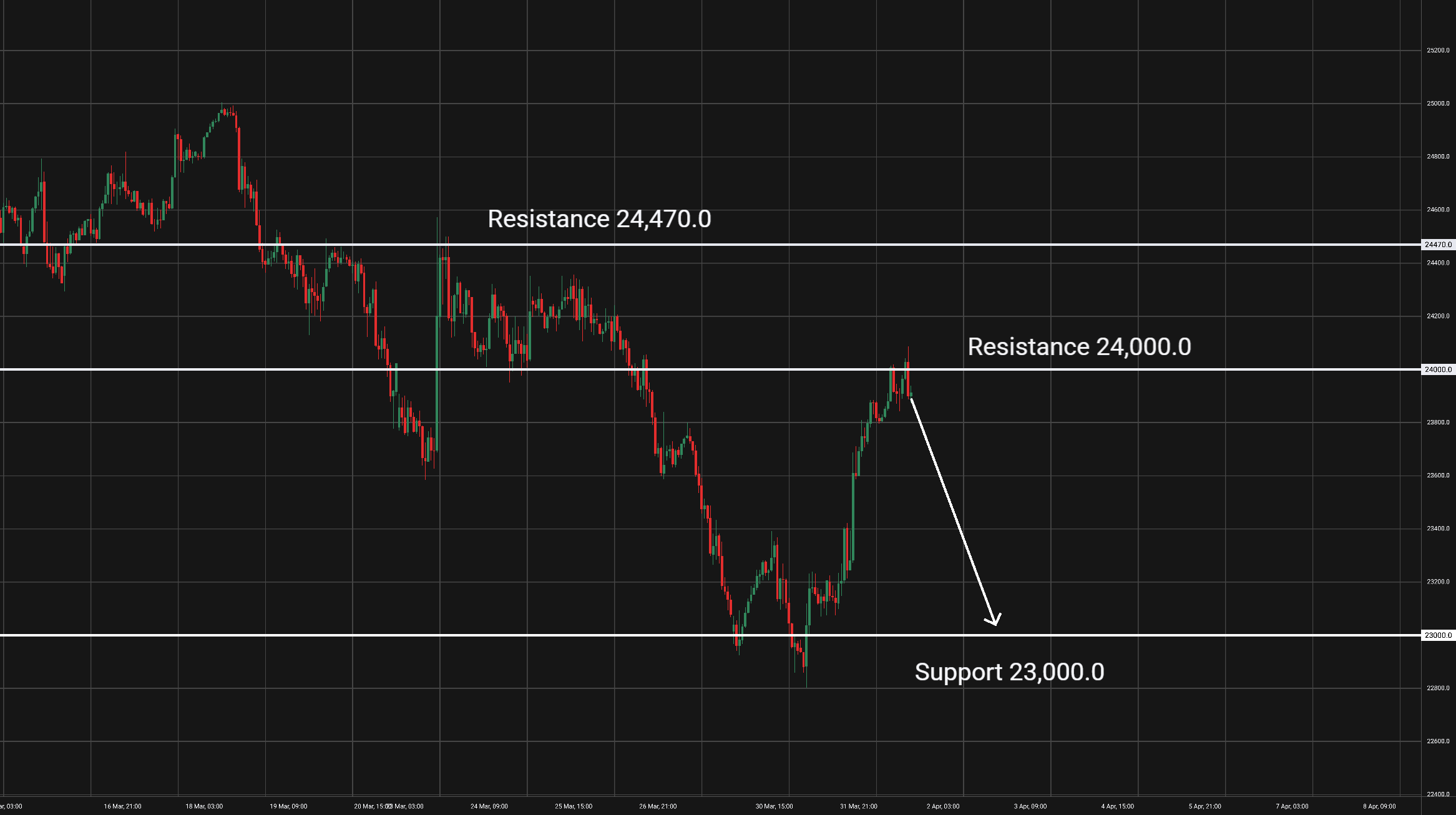 Nasdaq: Tento akciový index je na 1hodinovém grafu v klesajícím trendu několik hodin. Support je na hladině 24500 a 24000. V případě odrazu od supportu bychom mohli uvažovat o long pozici s cílem u nejbližší rezistence. V případě jasného prolomení supportu bychom mohli uvažovat o short pozici. Rezistence je na hladině 25870. Blížící se fundamentální zprávy by neměly ovlivnit vývoj tohoto trhu. -