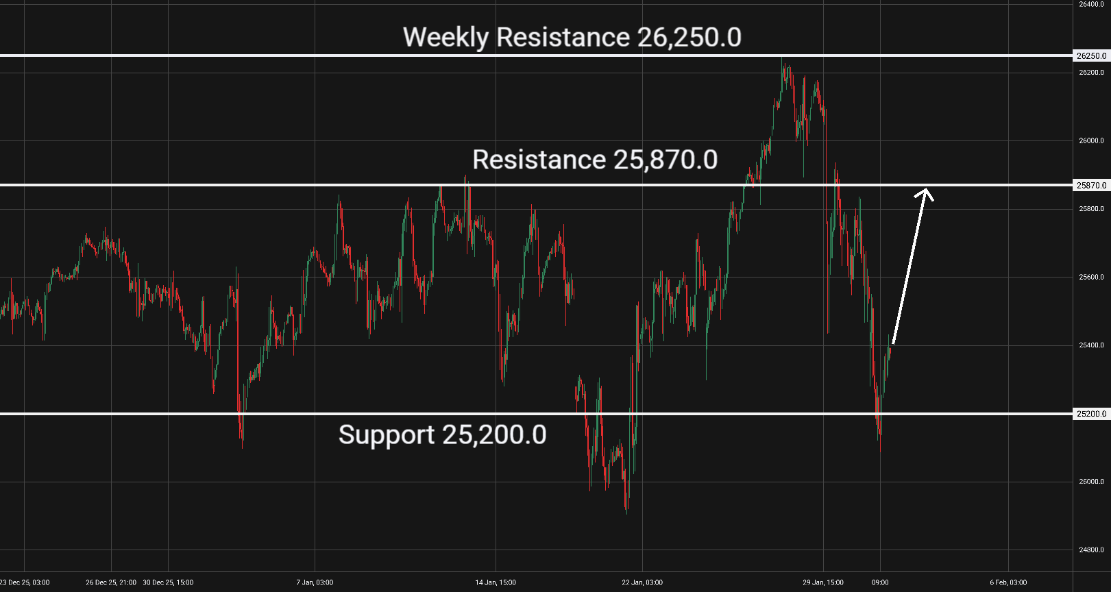 Nasdaq: Tento akciový index je na 1hodinovém grafu v rostoucím trendu několik hodin. Support je na hladině 25870 a 25200. Rezistence je na hladině 26250. V případě odrazu od rezistence bychom mohli uvažovat o short pozici s cílem u nejbližšího supportu. V případě jasného prolomení rezistence bychom mohli uvažovat o long pozici. Blížící se fundamentální zprávy by neměly ovlivnit vývoj tohoto trhu. -