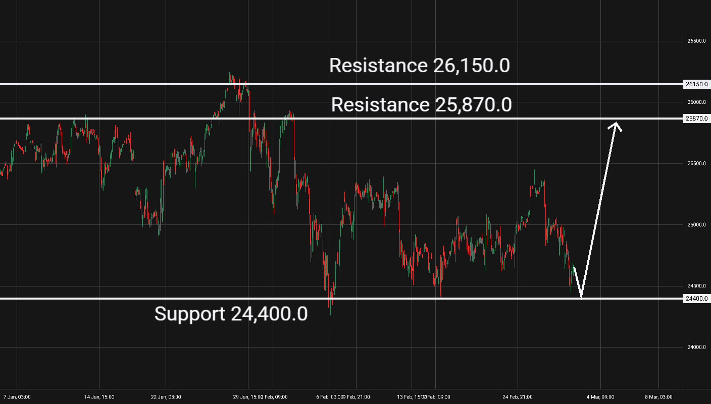 Nasdaq: Tento akciový index je na 1hodinovém grafu v klesajícím trendu několik hodin. Support je na hladině 24400. V případě odrazu od supportu bychom mohli uvažovat o long pozici s cílem u nejbližší rezistence. V případě jasného prolomení supportu bychom mohli uvažovat o short pozici. Rezistence je na hladině 25870 a 26150. Blížící se fundamentální zprávy (PMI v USA) by mohly ovlivnit vývoj tohoto trhu.