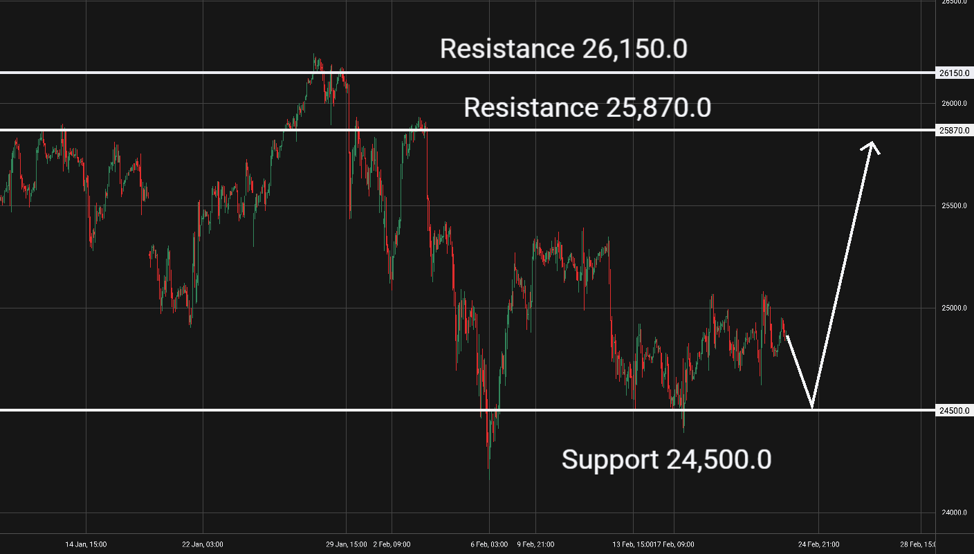Nasdaq: Tento akciový index je na 1hodinovém grafu v klesajícím trendu několik hodin. Support je na hladině 24500. V případě odrazu od supportu bychom mohli uvažovat o long pozici s cílem u nejbližší rezistence. V případě jasného prolomení supportu bychom mohli uvažovat o short pozici. Rezistence je na hladině 25870 a 26150. Blížící se fundamentální zprávy by neměly ovlivnit vývoj tohoto trhu.