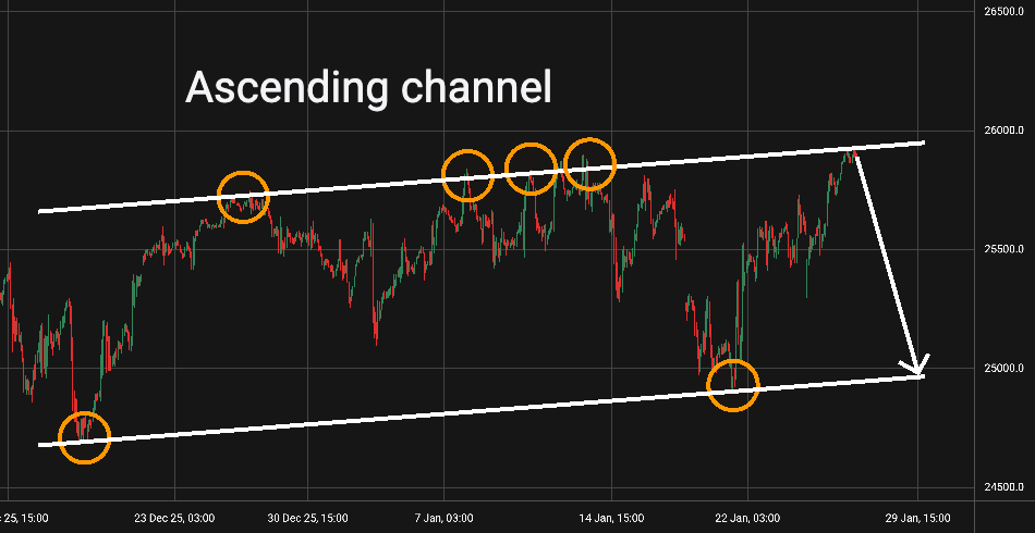 Možný scénář: Nyní bychom mohli počkat na odraz od horní linie kanálu a pak uvažovat o short pozici s cílem u spodní linie trendového kanálu.