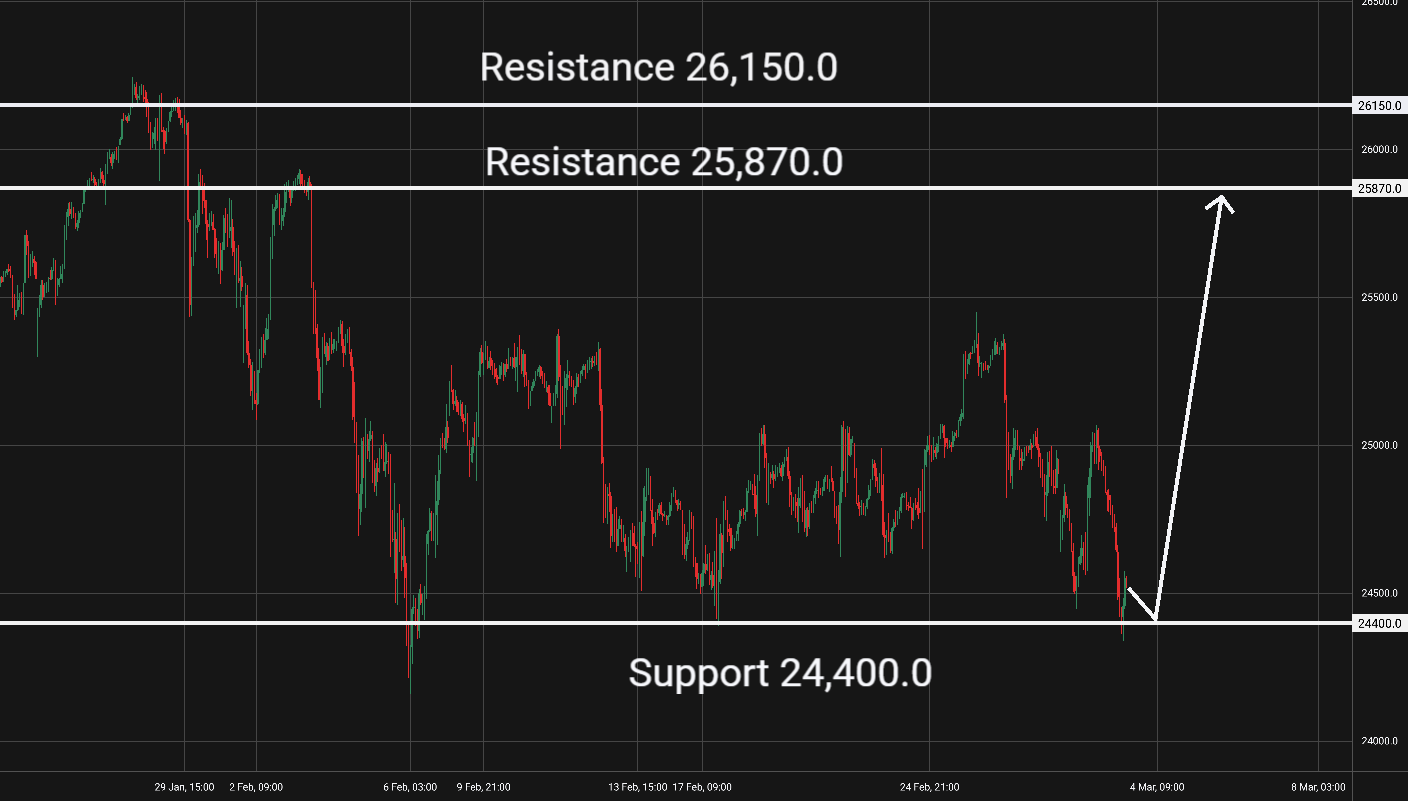 Nasdaq: Tento akciový index je na 1hodinovém grafu v klesajícím trendu několik hodin. Support je na hladině 24500. V případě odrazu od supportu bychom mohli uvažovat o long pozici s cílem u nejbližší rezistence. V případě jasného prolomení supportu bychom mohli uvažovat o short pozici. Rezistence je na hladině 25870 a 26150. Blížící se fundamentální zprávy by neměly ovlivnit vývoj tohoto trhu. -