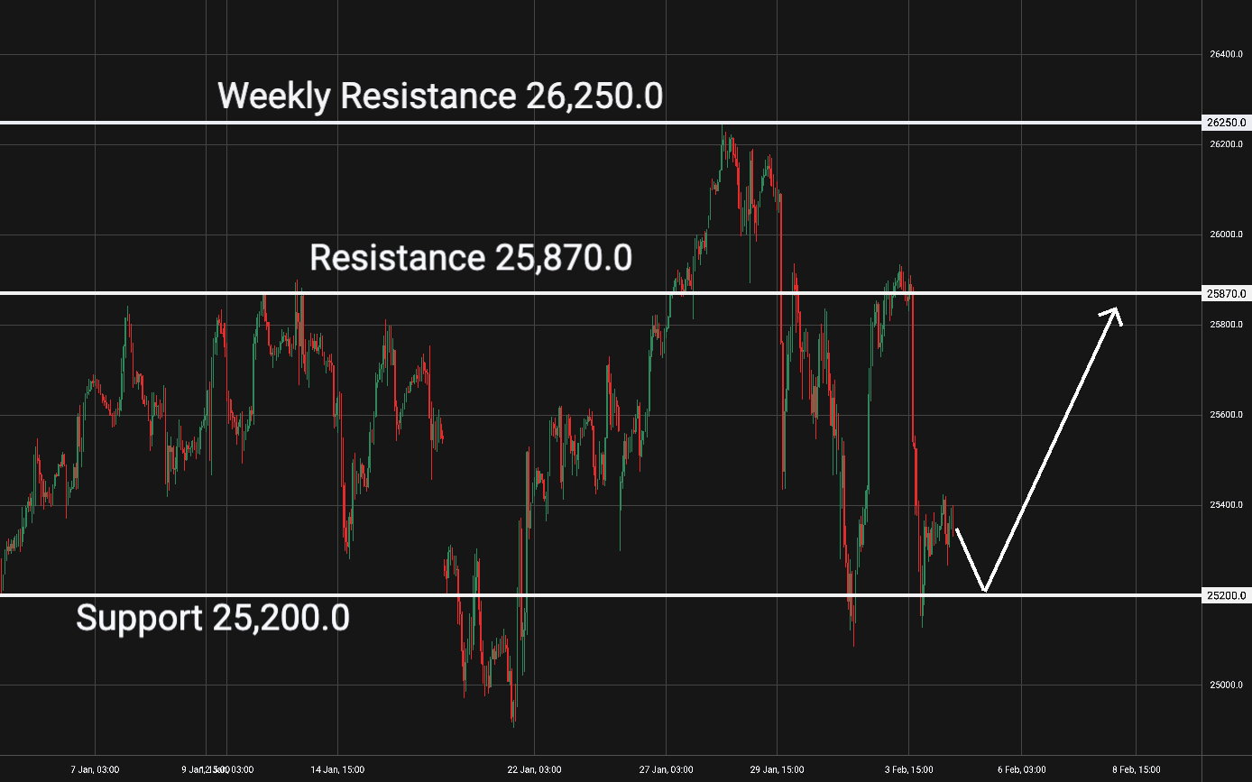 Nasdaq: Tento akciový index je na 1hodinovém grafu v klesajícím trendu několik hodin. Support je na hladině 25200. V případě odrazu od supportu bychom mohli uvažovat o long pozici s cílem u nejbližší rezistence. V případě jasného prolomení supportu bychom mohli uvažovat o short pozici. Rezistence je na hladině 25870 a 26250. Blížící se fundamentální zprávy by neměly ovlivnit vývoj tohoto trhu.