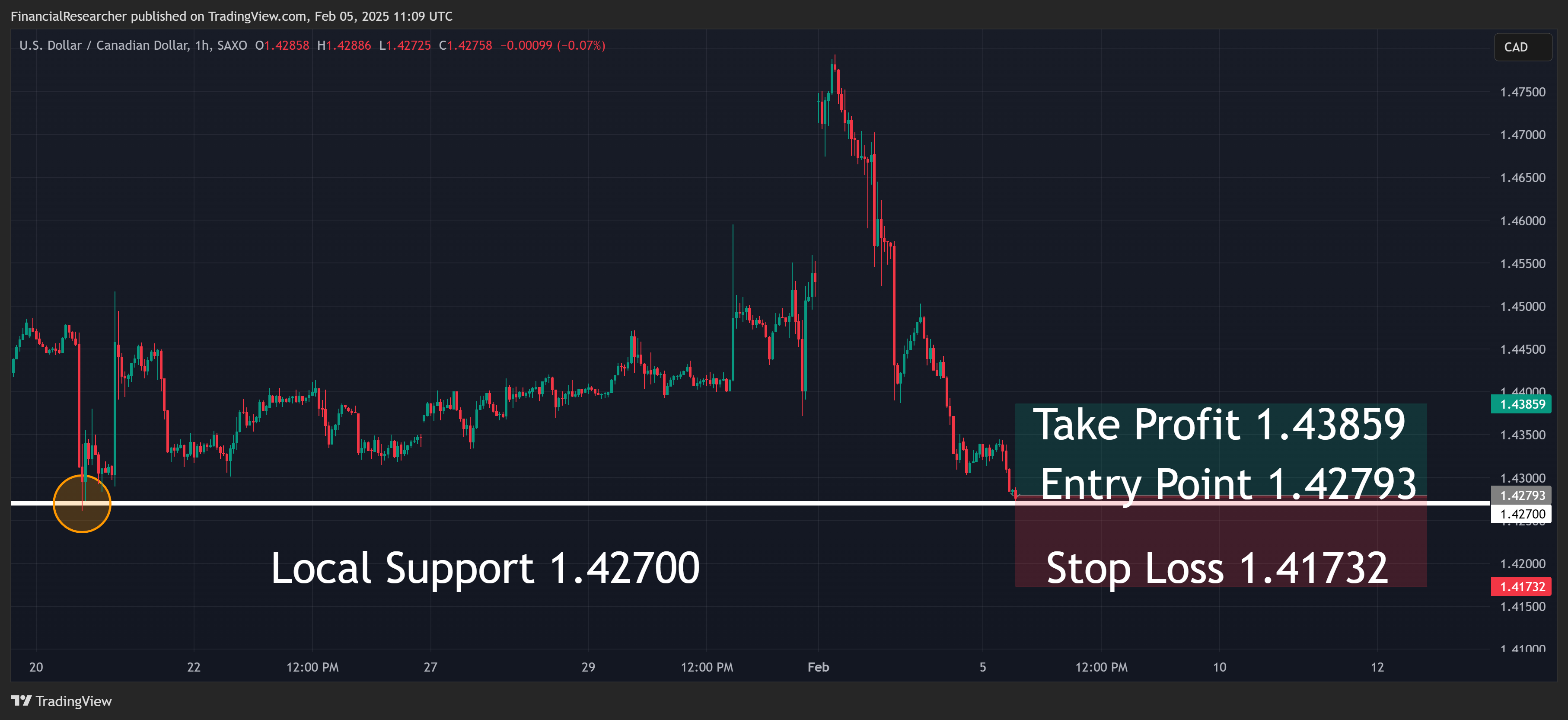 USD/CAD: Tento měnový pár je na 1hodinovém grafu v klesajícím trendu několik hodin. Cena se dostala k supportu 1,4270.