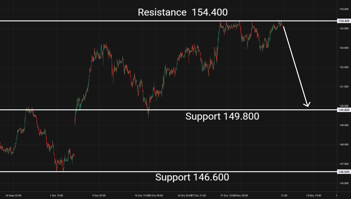 USD/JPY: Tento měnový pár je na 1hodinovém grafu v rostoucím trendu. Support je na hladině 149,80 a 146,60. Rezistence je na hladině 154,40. Nyní bychom mohli uvažovat o short pozici se Stop-Lossem nad předchozím maximem. Blížící se fundamentální zprávy by neměly ovlivnit tento měnový pár.
