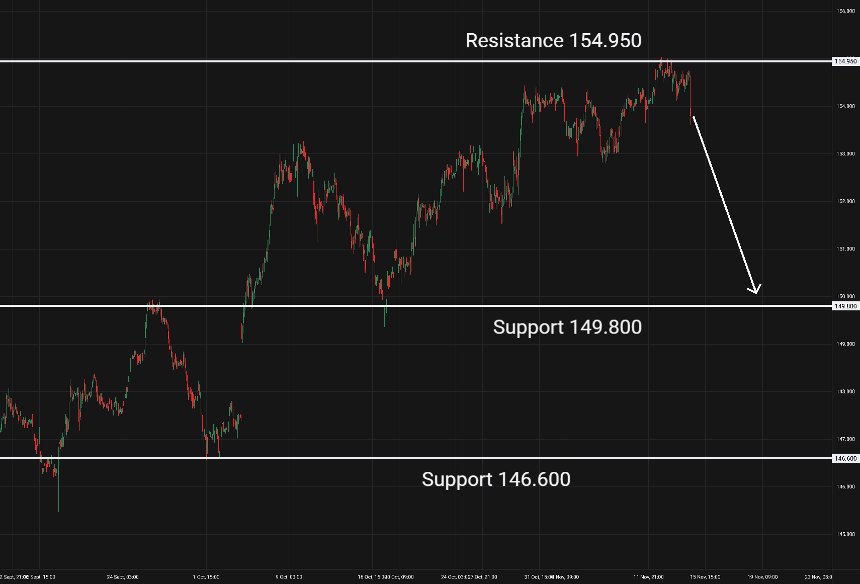 USD/JPY: Tento měnový pár je na 1hodinovém grafu v klesajícím trendu několik hodin. Support je na hladině 149,80 a 146,60. Rezistence je na hladině 154,95. Nyní bychom mohli uvažovat o short pozici se Stop-Lossem nad předchozím maximem. Blížící se fundamentální zprávy by neměly ovlivnit tento měnový pár. Někteří obchodníci mohou v pátek uzavírat své pozice, což by mohlo dostat tento trh pod tlak.