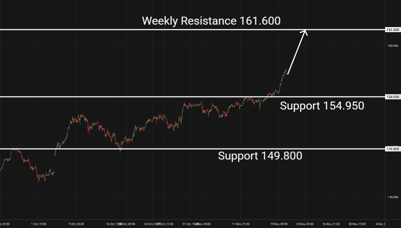 USD/JPY: Tento měnový pár je na 1hodinovém grafu v rostoucím trendu několik hodin. Support je na hladině 154,95 a 149,80. Rezistence je na hladině 161,60. Nyní bychom mohli uvažovat o long pozici se Stop-Lossem pod předchozím minimem. Blížící se fundamentální zprávy by neměly ovlivnit tento měnový pár.