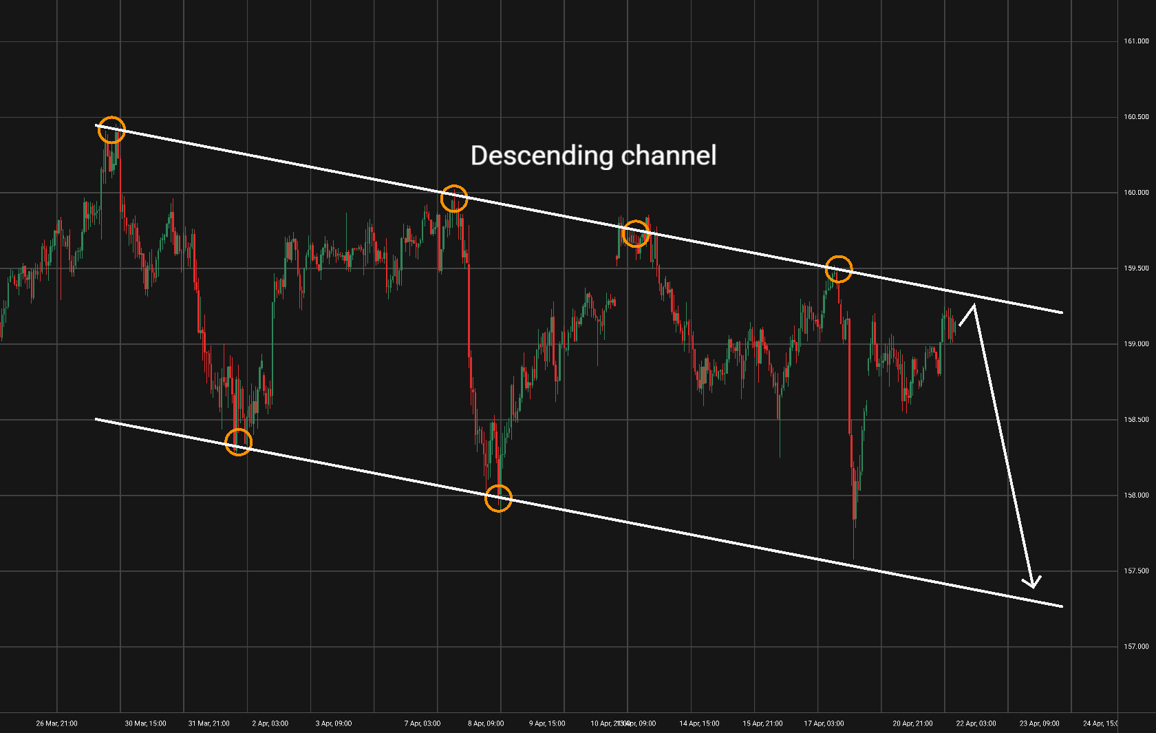 Možný scénář: Nyní bychom mohli počkat na odraz od horní linie kanálu a pak uvažovat o short pozici s cílem u spodní linie trendového kanálu.