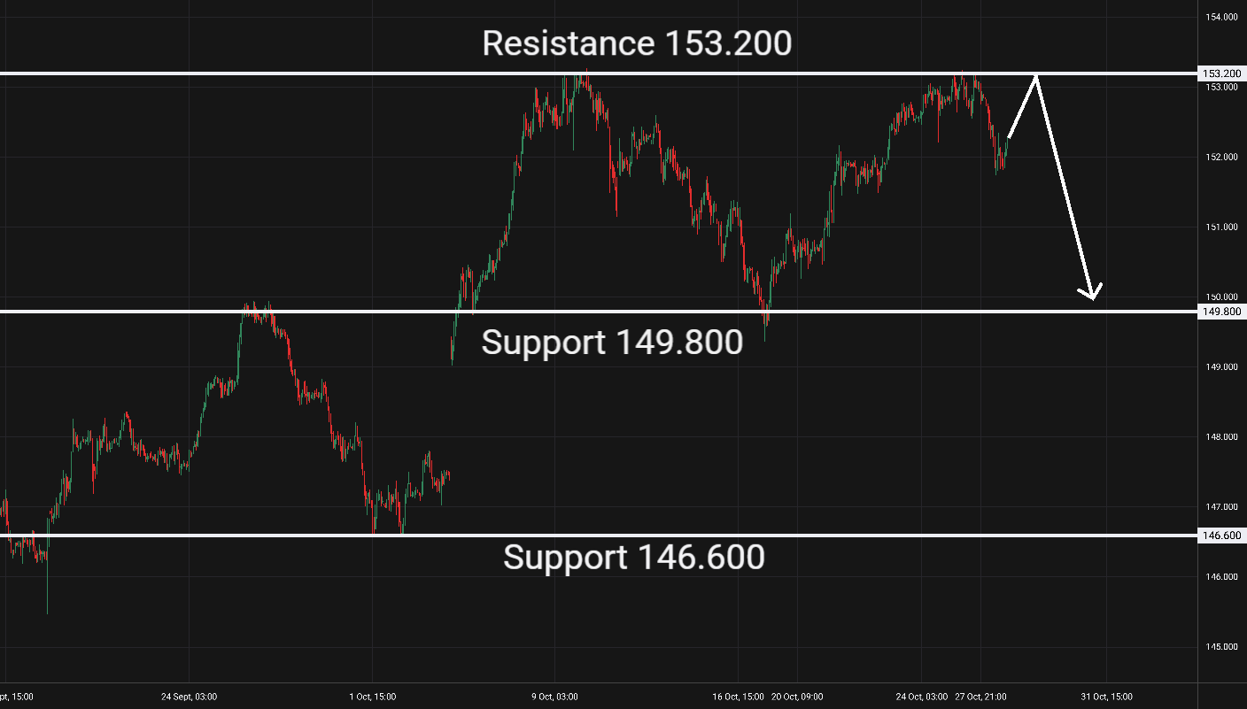 USD/JPY: Tento měnový pár je na 1hodinovém grafu dnes v rostoucím trendu. Support je na hladině 151,10 a 148,90. Rezistence je na hladině 153,70. V případě odrazu od rezistence bychom mohli uvažovat o short pozici s cílem u nejbližšího supportu. V případě jasného prolomení rezistence bychom mohli uvažovat o long pozici. Blížící se fundamentální zprávy by neměly ovlivnit tento měnový pár. -
