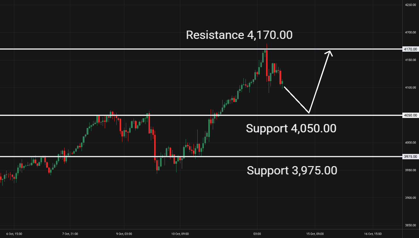 Zlato (XAU/USD): Tato komodita je na 1hodinovém grafu v klesajícím trendu několik hodin. Support je na hladině 4050 a 3975. V případě odrazu od supportu bychom mohli uvažovat o long pozici s cílem u nejbližší rezistence. V případě jasného prolomení supportu bychom mohli uvažovat o short pozici. Rezistence je na hladině 4170. Blížící se fundamentální zprávy (projev šéfa Fedu) by mohly ovlivnit vývoj tohoto trhu.