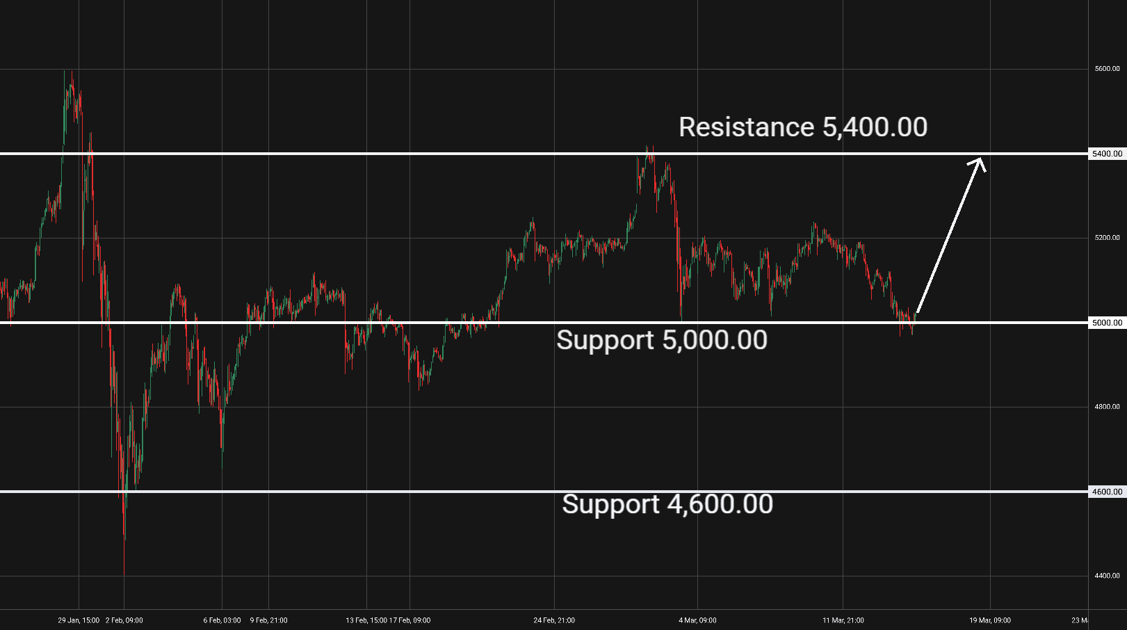 Zlato (XAU/USD): Tato komodita je na 1hodinovém grafu v klesajícím trendu. Support je na hladině 5000 a 4600. Rezistence je na hladině 5400. Nyní bychom mohli uvažovat o long pozici se Stop-Lossem pod předchozím minimem. Blížící se fundamentální zprávy by neměly ovlivnit vývoj tohoto trhu.