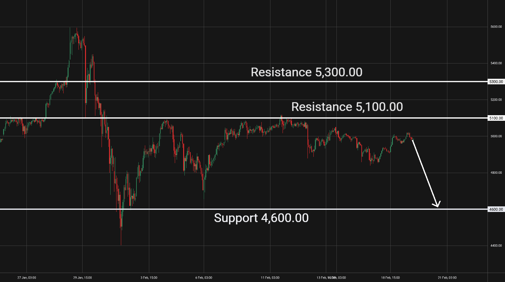 Zlato (XAU/USD): Tato komodita je na 1hodinovém grafu v klesajícím trendu. Support je na hladině 4600. Rezistence je na hladině 5100 a 5300. Nyní bychom mohli uvažovat o short pozici se Stop-Lossem nad předchozím maximem. Blížící se fundamentální zprávy by neměly ovlivnit vývoj tohoto trhu.