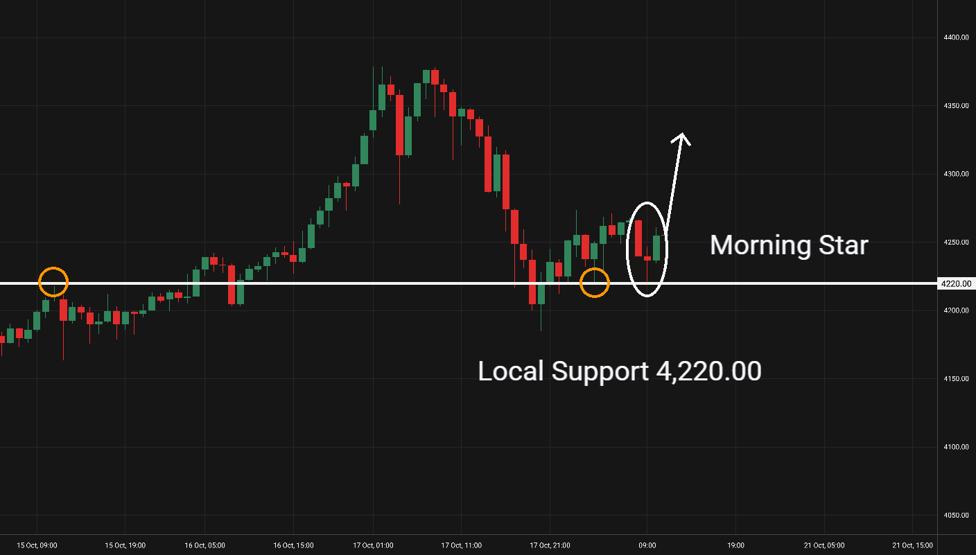 Zlato (XAU/USD): Tato komodita je na 1hodinovém grafu v klesajícím trendu několik hodin. Vytvořila se formace ranní hvězda (Morning Star) na lokálním supportu. Cena je tak připravena na růst a mohli bychom uvažovat o long pozici. Blížící se fundamentální zprávy by neměly ovlivnit vývoj tohoto trhu.