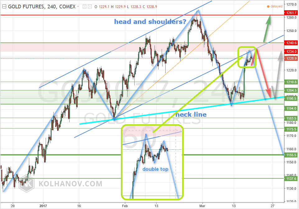 Na kratším 1hodinovém časovém rámci utváří cena zlata (XAU/USD, GOLD) formaci dvojitý vrchol značící možný pokles. Na 4hodinovém grafu vidíme tvořící se formaci hlava a ramena. Za signál zahájení klesajícího trendu budeme považovat odraz od rezistence 1234 - 1240, pokles pak zřejmě bude pokračovat směrem k supportu 1198 - 1200.
