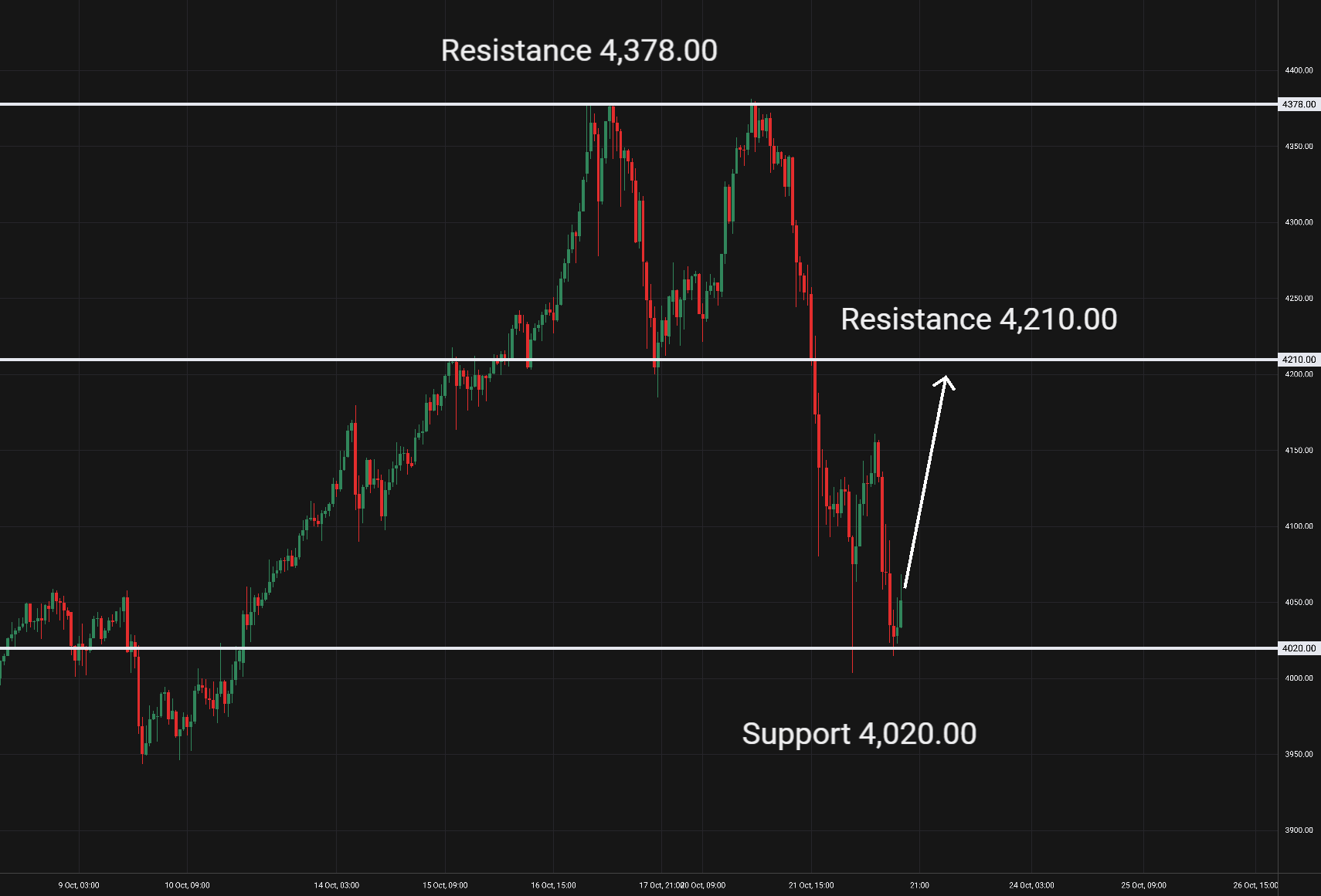Zlato (XAU/USD): Tato komodita je na 1hodinovém grafu v klesajícím trendu několik hodin. Support je na hladině 4200 a 4100. Rezistence je na hladině 4378. V případě odrazu od supportu bychom mohli uvažovat o long pozici s cílem u nejbližší rezistence. V případě jasného prolomení supportu bychom mohli uvažovat o short pozici. -