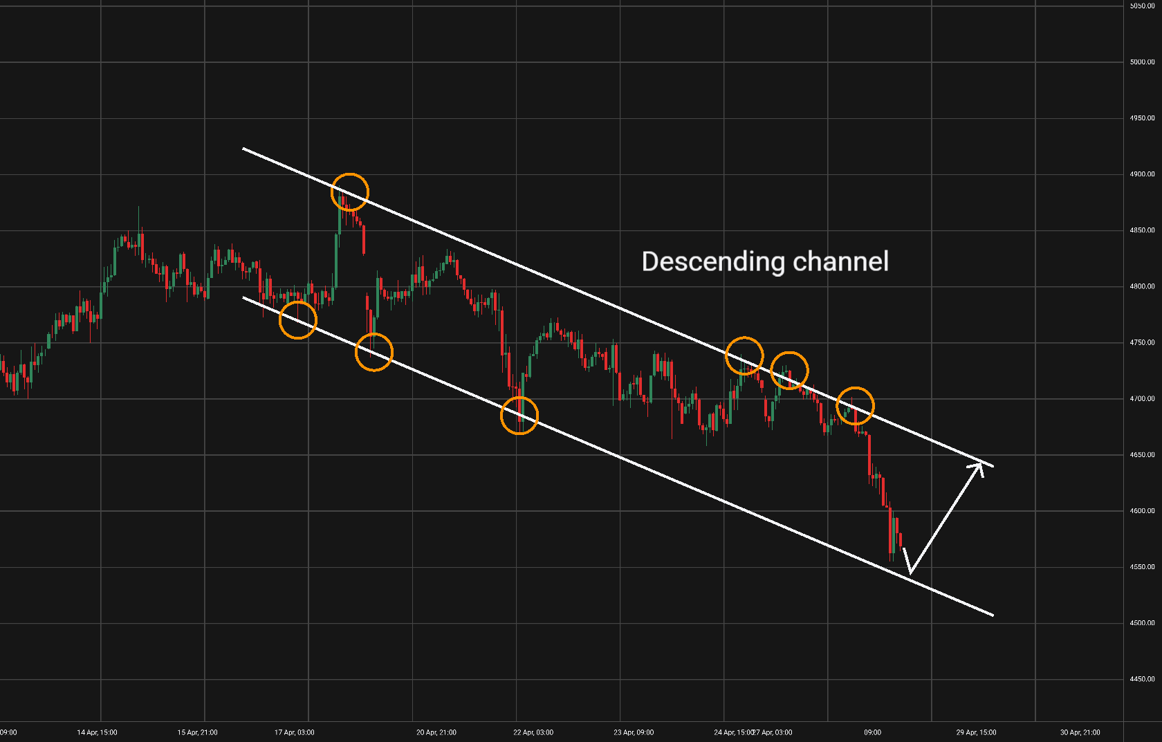 Možný scénář: Nyní bychom mohli počkat na odraz od spodní linie kanálu a pak uvažovat o long pozici s cílem u horní linie trendového kanálu.