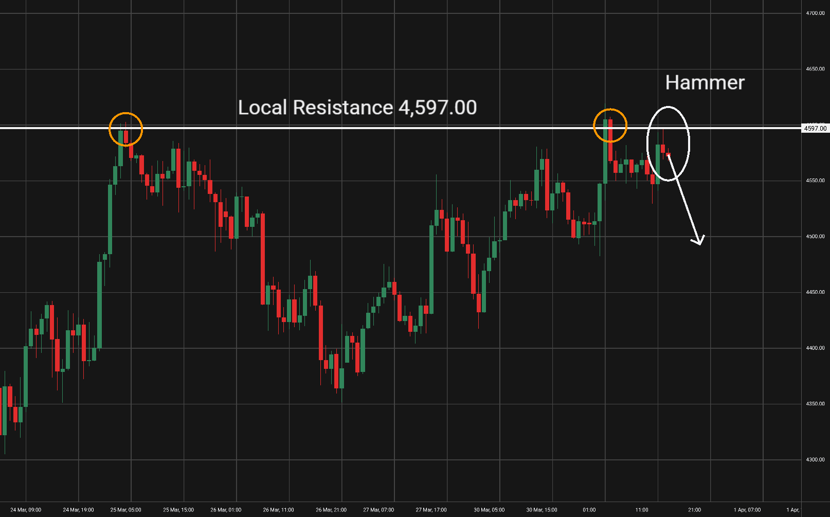 Zlato (XAU/USD): Tato komodita je na 1hodinovém grafu v rostoucím trendu několik hodin. Vytvořila se formace kladivo (Hammer) na lokální rezistenci. Cena je tak připravena na pokles a mohli bychom uvažovat o short pozici. Blížící se fundamentální zprávy (pracovní místa JOLTS) by mohly ovlivnit vývoj tohoto trhu.