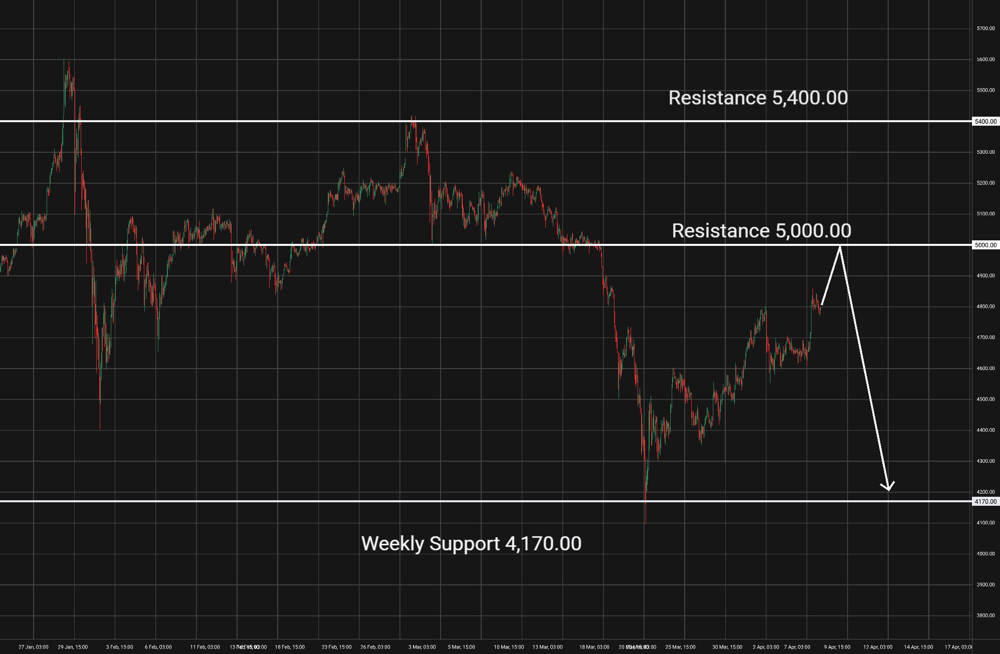 Zlato (XAU/USD): Tato komodita je na 1hodinovém grafu v rostoucím trendu. Support je na hladině 4600. Rezistence je na hladině 5100 a 5300. V případě odrazu od rezistence bychom mohli uvažovat o short pozici s cílem u nejbližšího supportu. V případě jasného prolomení rezistence bychom mohli uvažovat o long pozici. Blížící se fundamentální zprávy by neměly ovlivnit vývoj tohoto trhu. -