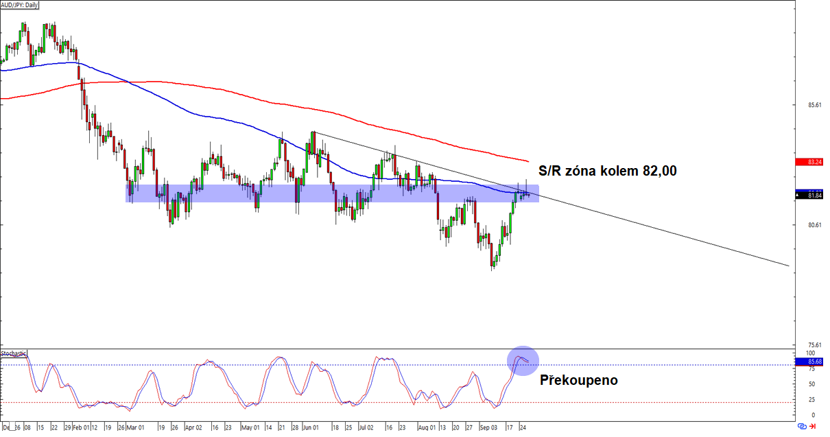 AUD/JPY: Tento měnový pár má na denním grafu potíže s proražením nad důležitou psychologickou hladinu 82,00, protože koresponduje s klesající trendovou čarou, klouzavým průměrem SMA 100 a s S/R zónou. Stochastic vysílá překoupený signál. Jestli věříte v pokles, tak short pozice při náznaku medvědího momenta se zdá být jako dobré obchodní nastavení. Jestli však očekáváte růst, tak si počkejte na proražení rezistence a pak hledejte long příležitost. Nechte v každém případě dostatek prostoru pro Stop-Loss pro případ zvýšené volatility.