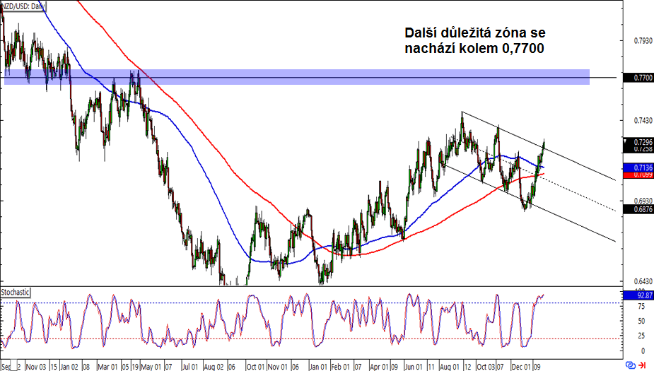 NZD/USD: Tento měnový pár na denním grafu zřejmě proráží nad klesající trendový kanál. Další zajímavá úroveň na tomto denním grafu je až hladina kolem 0,7700. Jestli věříte v pokračování růstu, tak je stále čas uvažovat o vstupu do long pozice již na současné úrovni. Jestli jste ale konzervativnější, tak si můžete počkat na několik dalších býčích svíček pro potvrzení růstu. Nechte ovšem dostatek prostoru pro Stop-Loss pro případ zvýšené volatility.